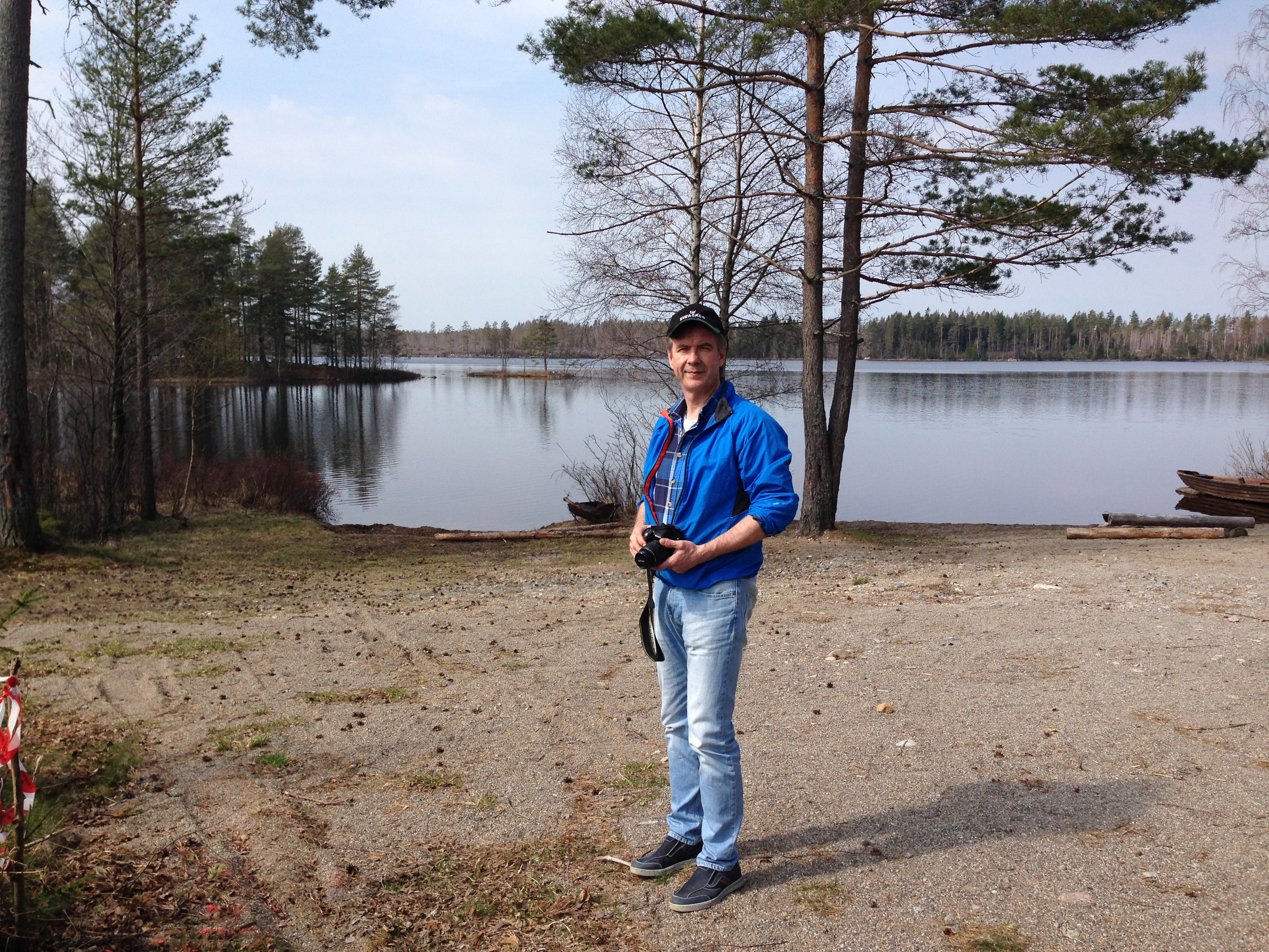 - Beskrivning: Stefan Toterud med kamera framför sjö, Ekopark Öjesjöbrännan