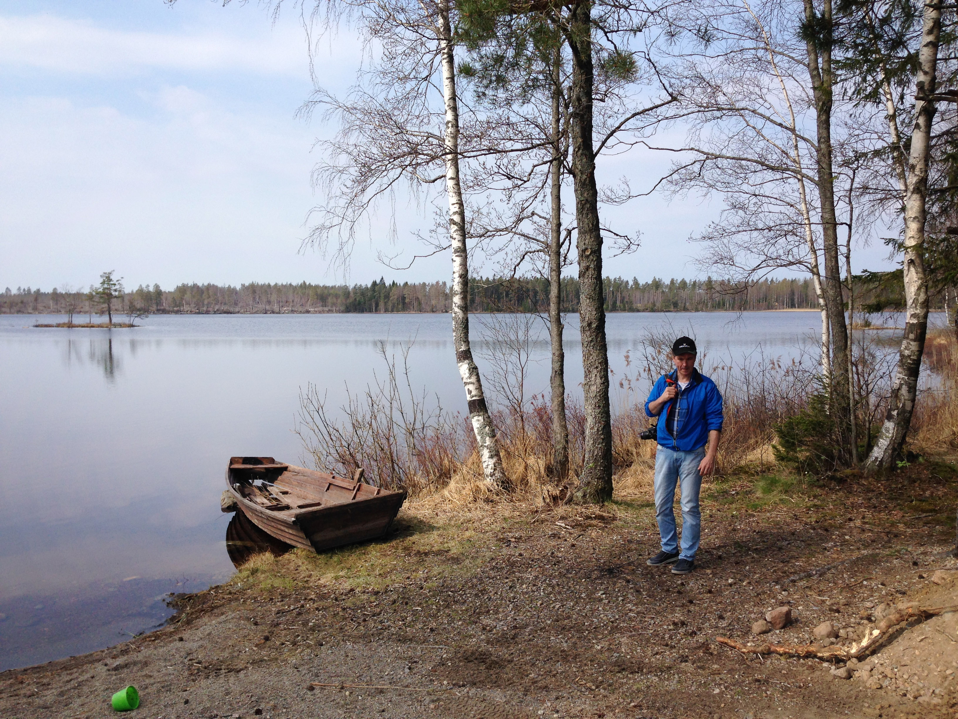 - Beskrivning: Stefan Toterud med kamera framför sjö, liten träbåt, eka, roddbåt, Ekopark Öjesjöbrännan