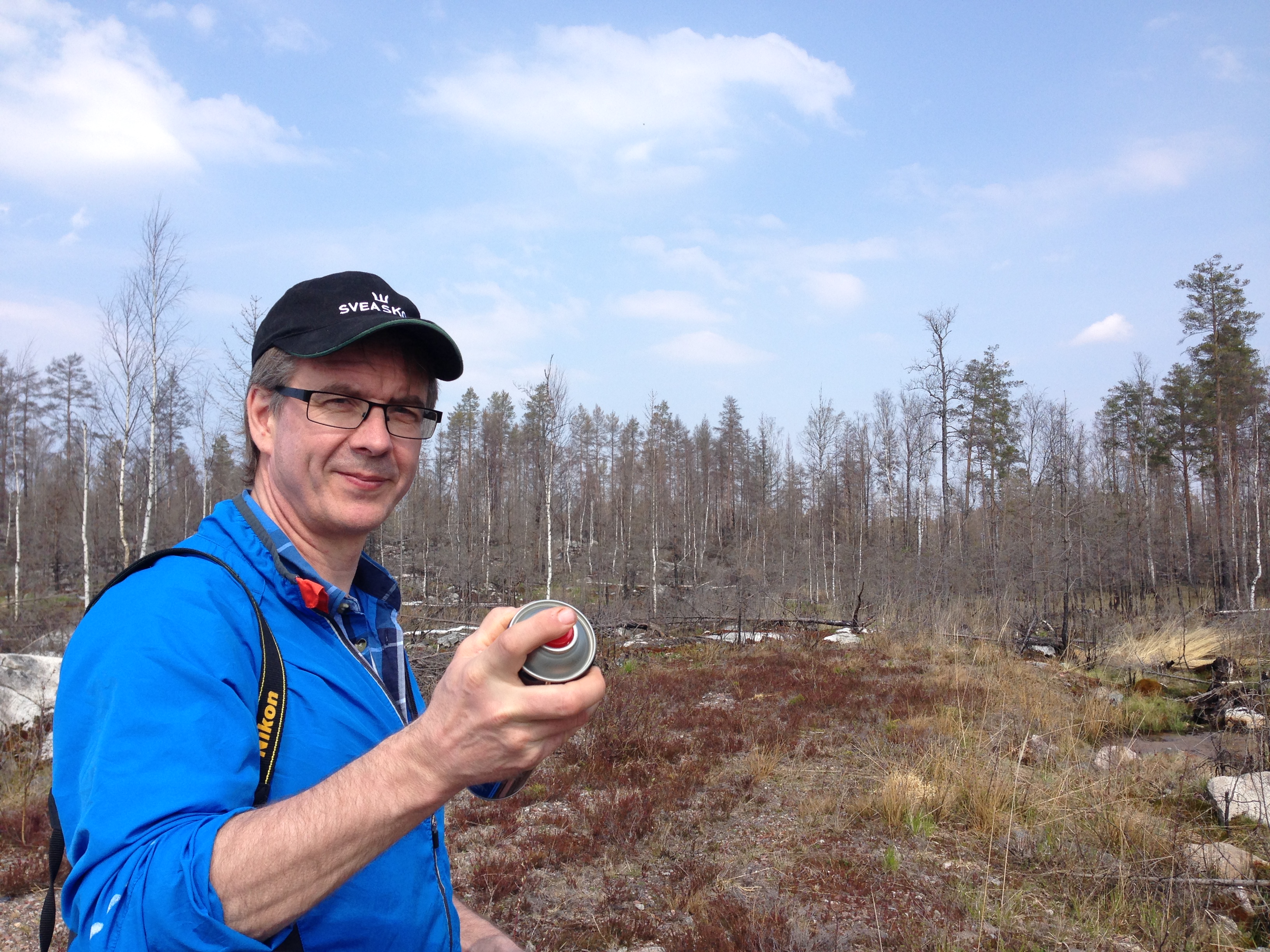 - Beskrivning: Stefan Toterud i Ekopark Öjesjöbrännan med sprejfärg, märkning av träd