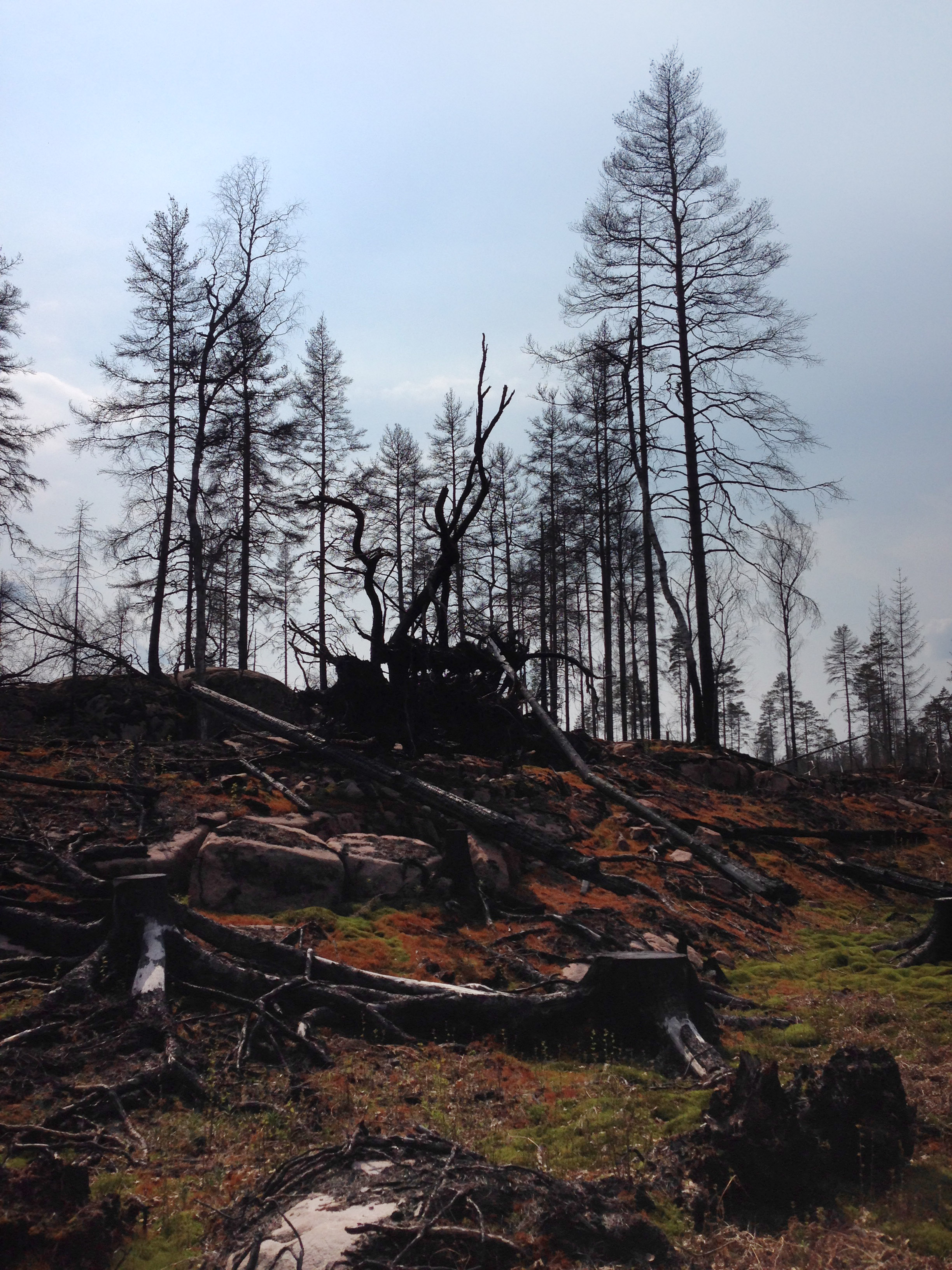 - Beskrivning: Ekopark Öjesjöbrännan, efter brand, bränning, kol, förkolnad