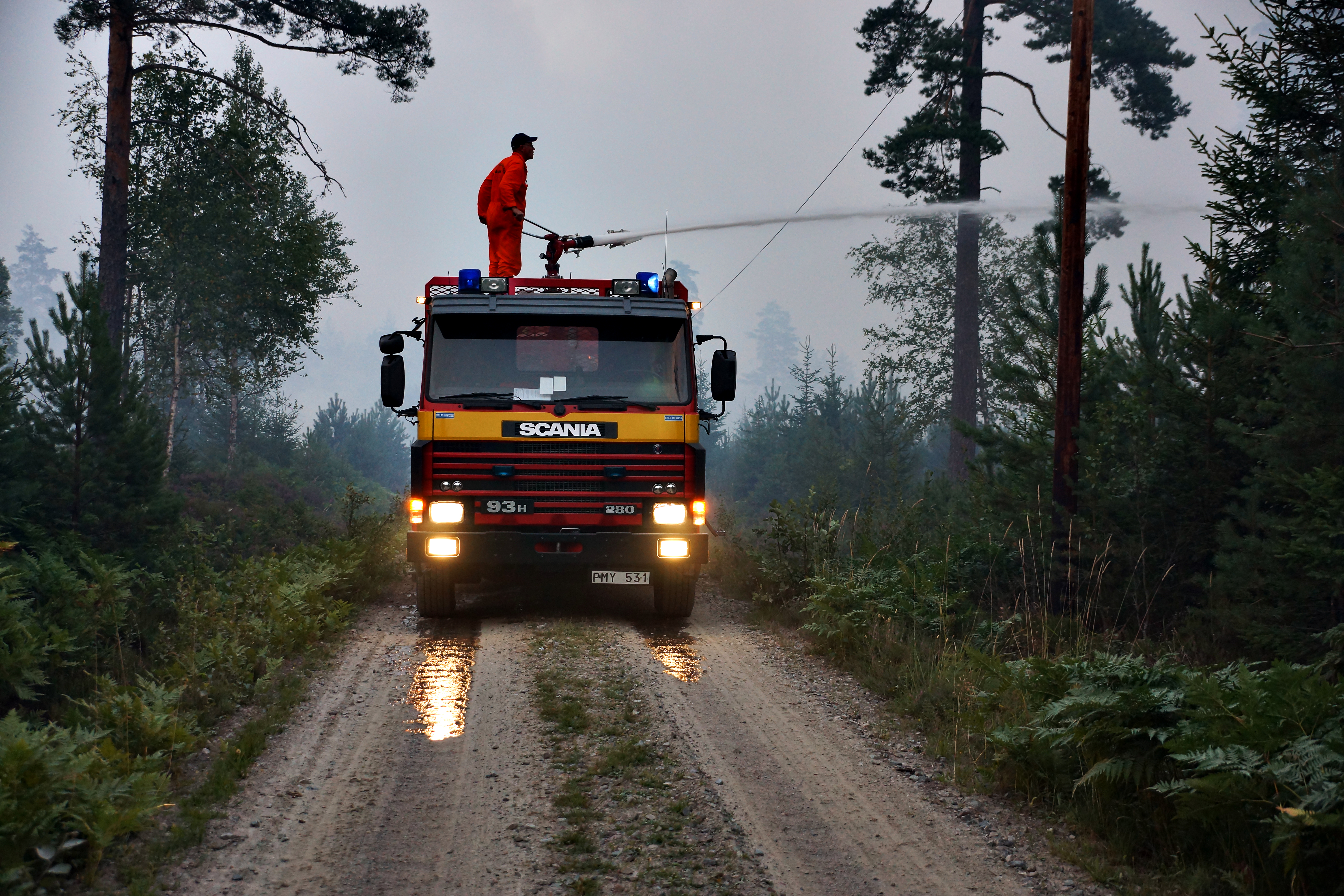 - Beskrivning: Släckning, vattenslang, vatten, släckningsarbete, bil, Skogsbrand Ekopark Öjesjöbrännan, Ekopark, brand, MO Mitt