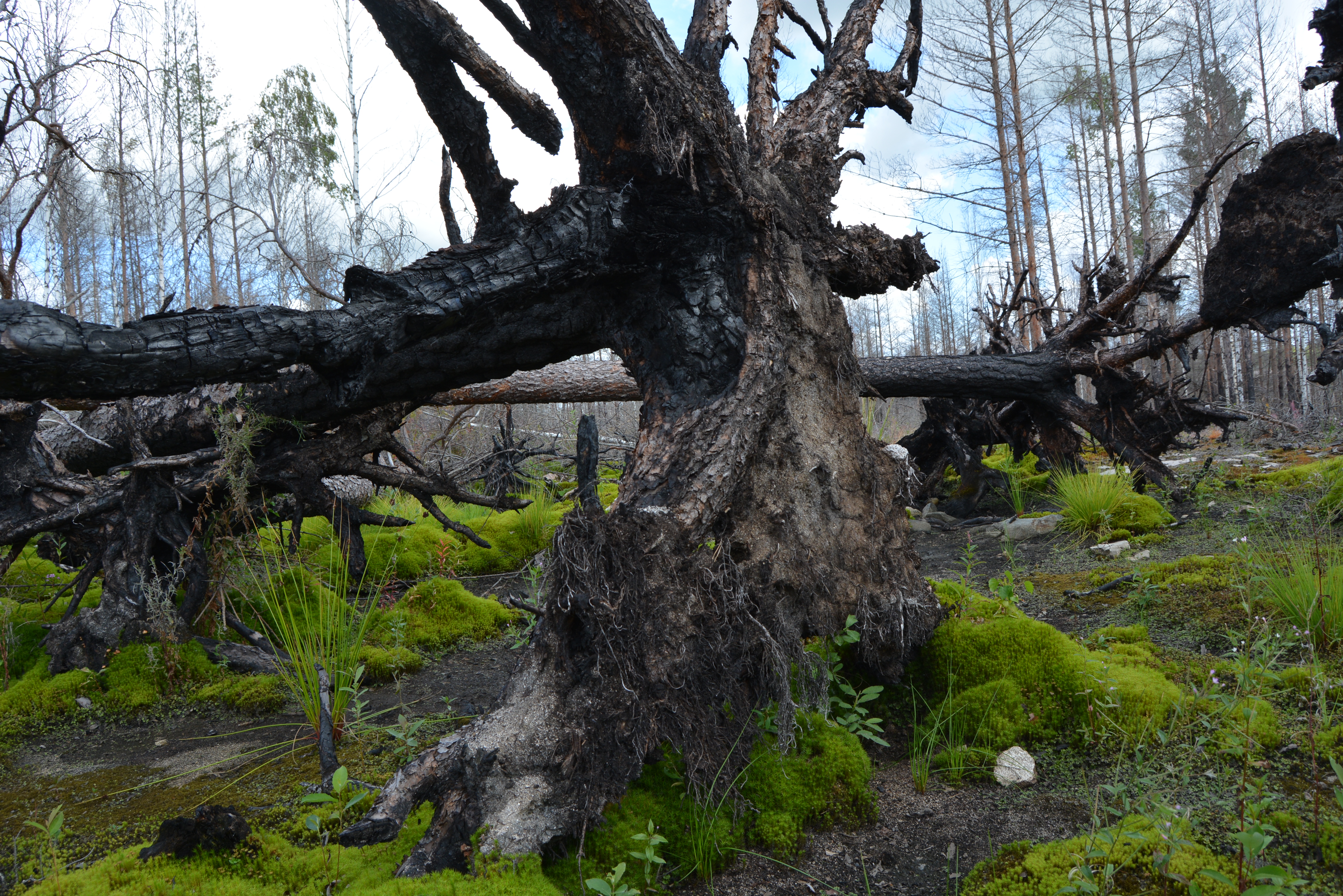 - Beskrivning: Död ved, stubbe, kol, grönskande mossa, fällda träd, fallna träd, Ekopark Öjesjöbrännan, liv efter brand, växtlighet, liv, pånyttfödelse