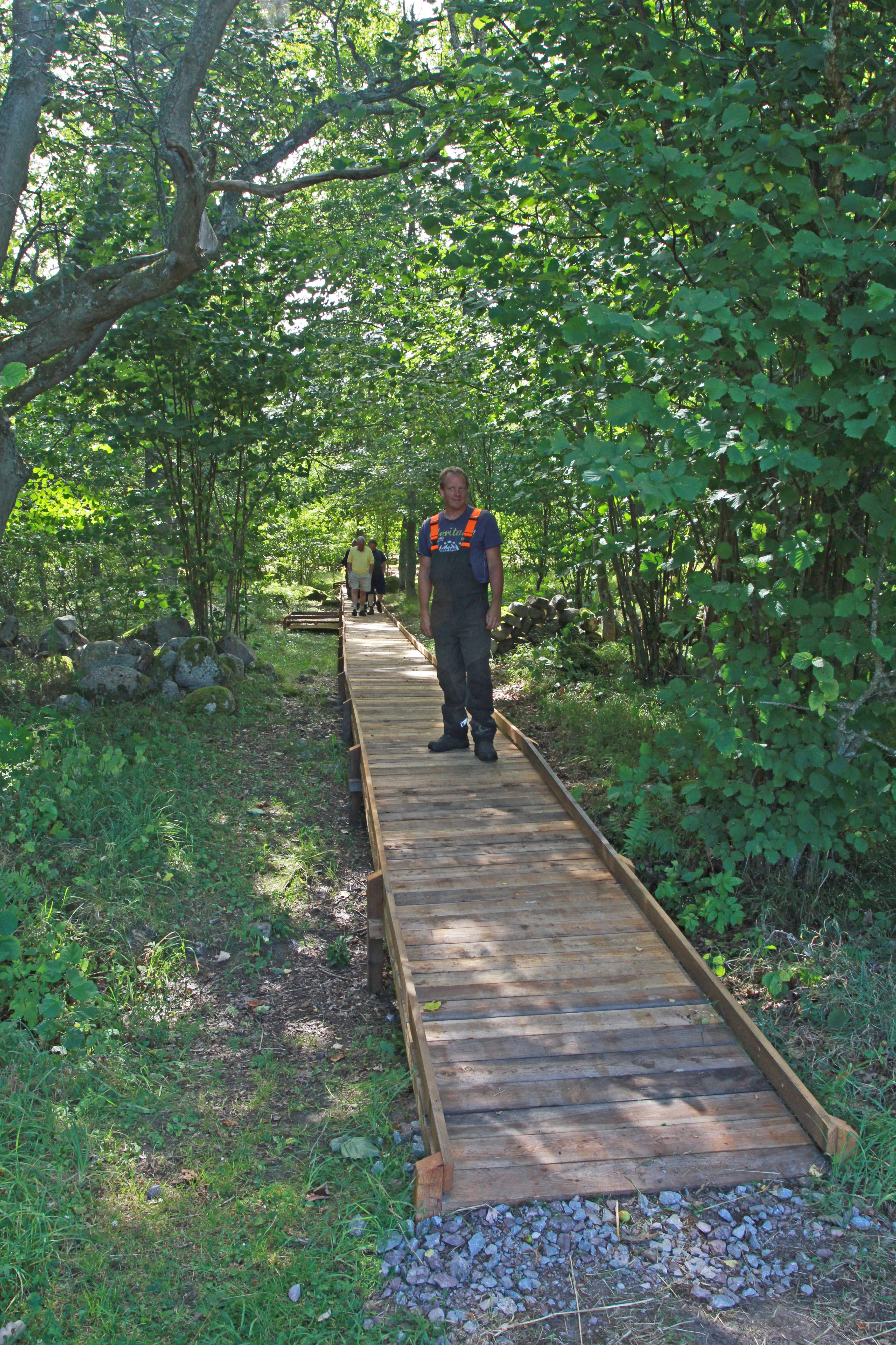 - Beskrivning: En av snickarna som byggt den nya bron, Nybyggd gångbro ökar tillgängligheten i Ekopark Böda, ramp
