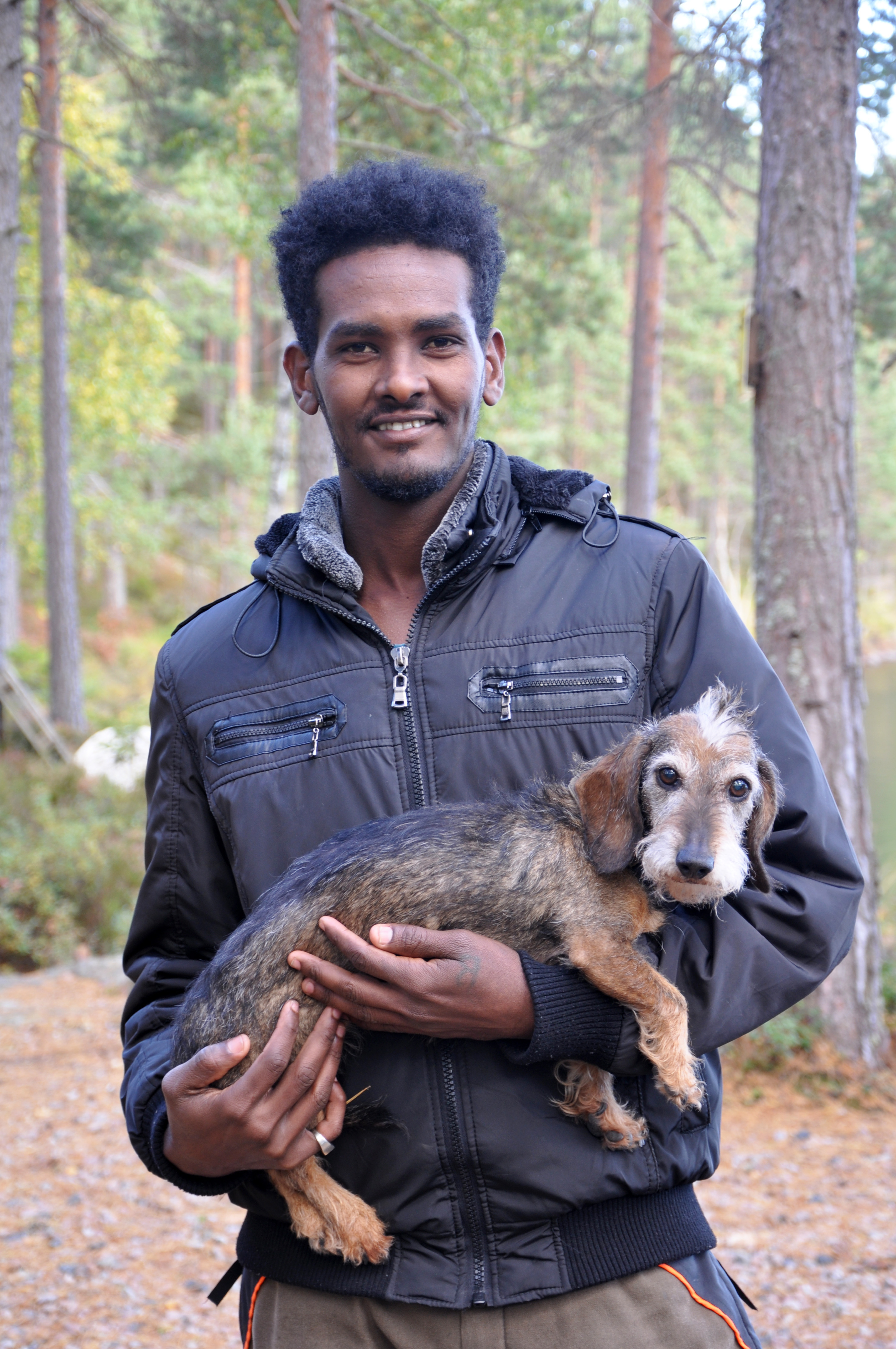 - Beskrivning: Dawit Kesete med hund i famnen. Sveaskogs integrationsprojekt Växtkraft, integration, nysvenskar