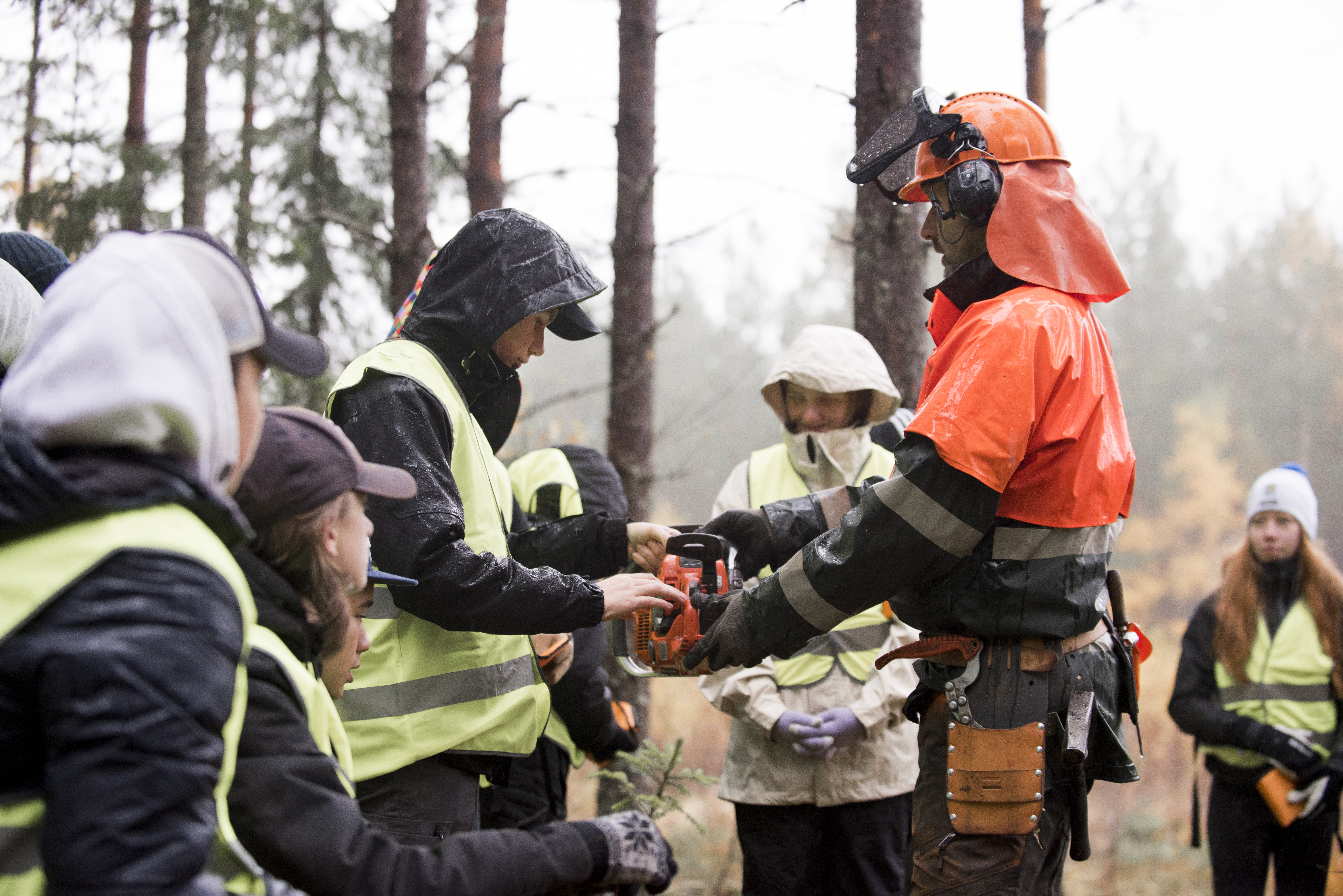 - Beskrivning: Studiebesök, röjningsutrustning, frågestund, Skogsdag med niondeklassare, 9:an, elever, utbildning, skola, barn, ungdomar, tonåringar, premiär för projektet: Sveaskog i skolan, klass nio, ögonöppnare innan gymnasieval, Åvestadalskolan i Krylbo, framtiden