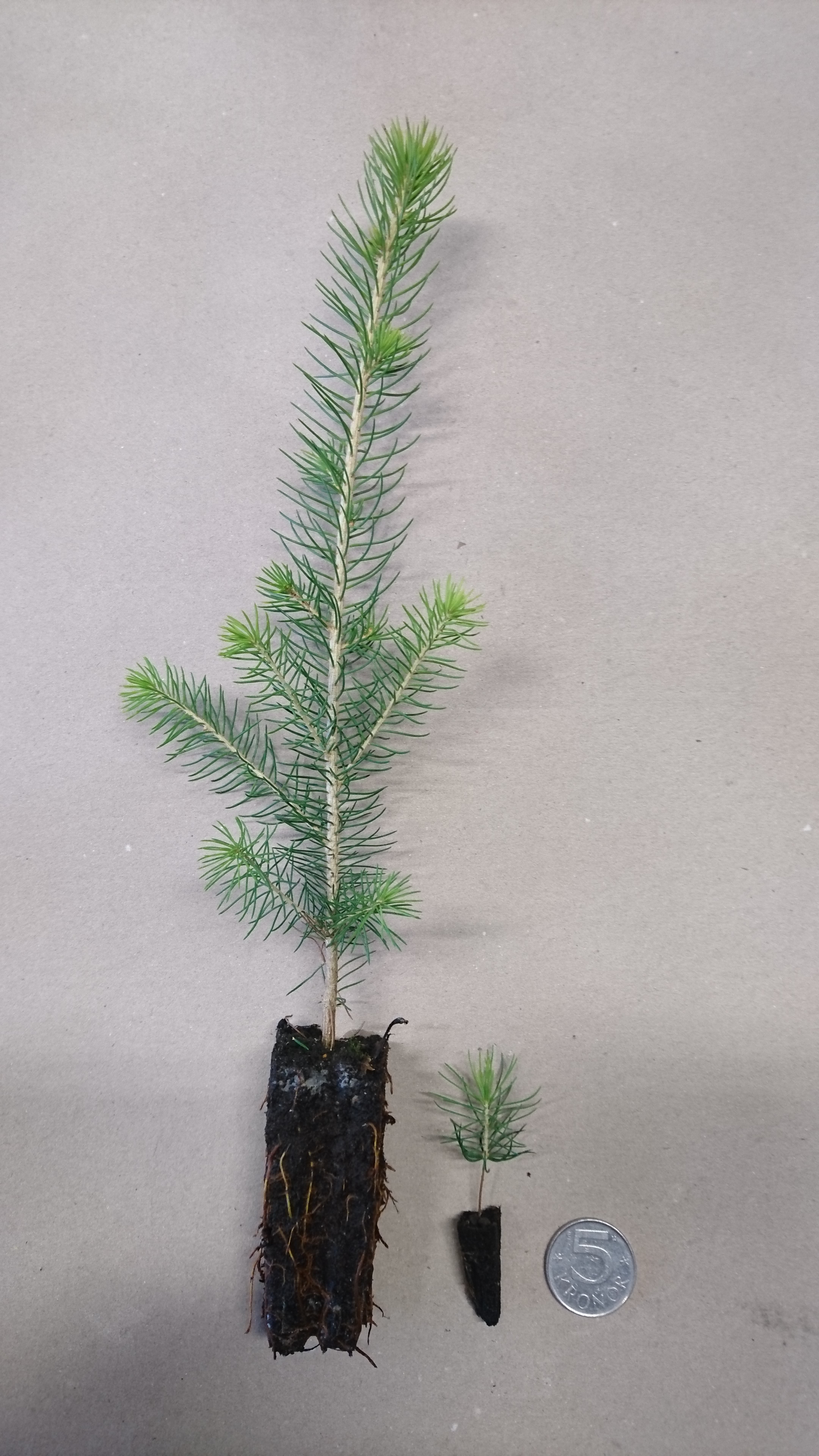 - Beskrivning: Storleksjämförelse Mikroplanta, bredvid vanligt planta samt 5-krona, Svenska Skogsplantors mikroplantor, plantor, mikro, micro, små plantor, inte mycket större än en fem-krona, nytt hightech-system, projekt för att spara plats i växthusen