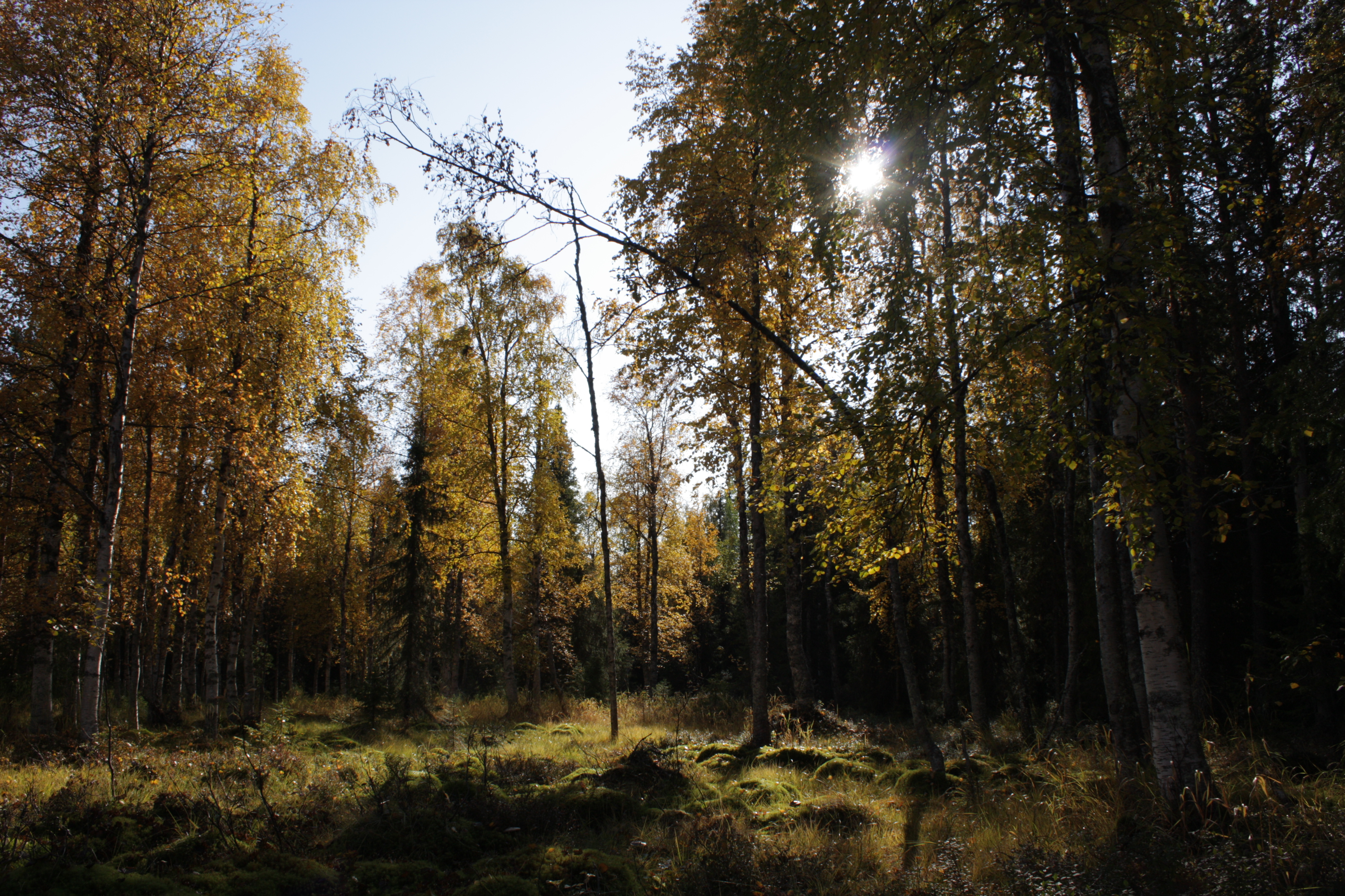 - Beskrivning: Ekopark Naakajärvi, lövrik glänta i mystiskt ljus, intill Aareajoki