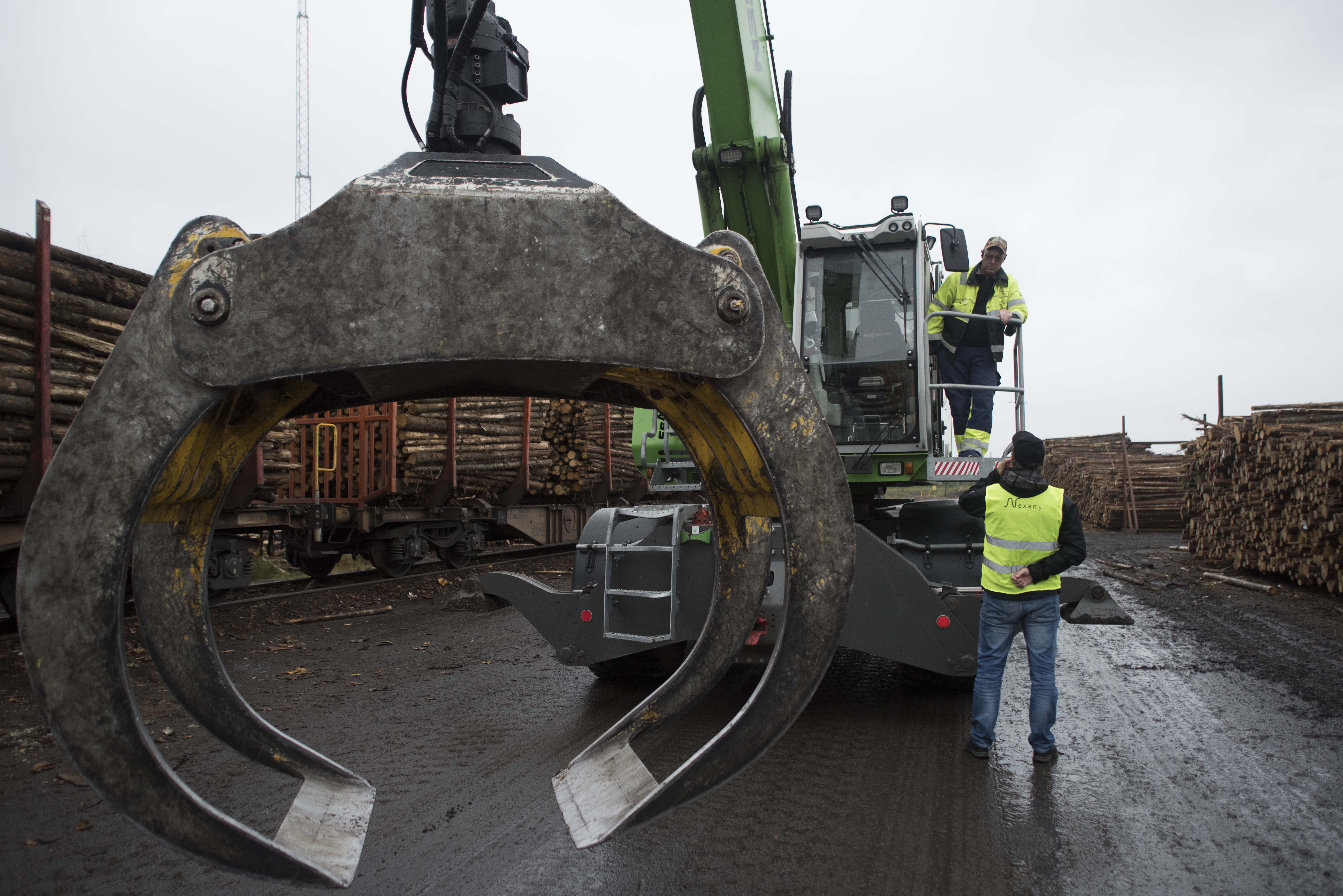 - Beskrivning: Mats Haapala på Stockarydsterminalen AB och Krister Bergman, logistiker på Sveaskog, Tåglast med massaved från Stockaryd till Östrand, sommaren 2018 ska SCA:s nya stora massafabrik stå färdig, för att det ska hända behövs massor av råvara, timmerleverans