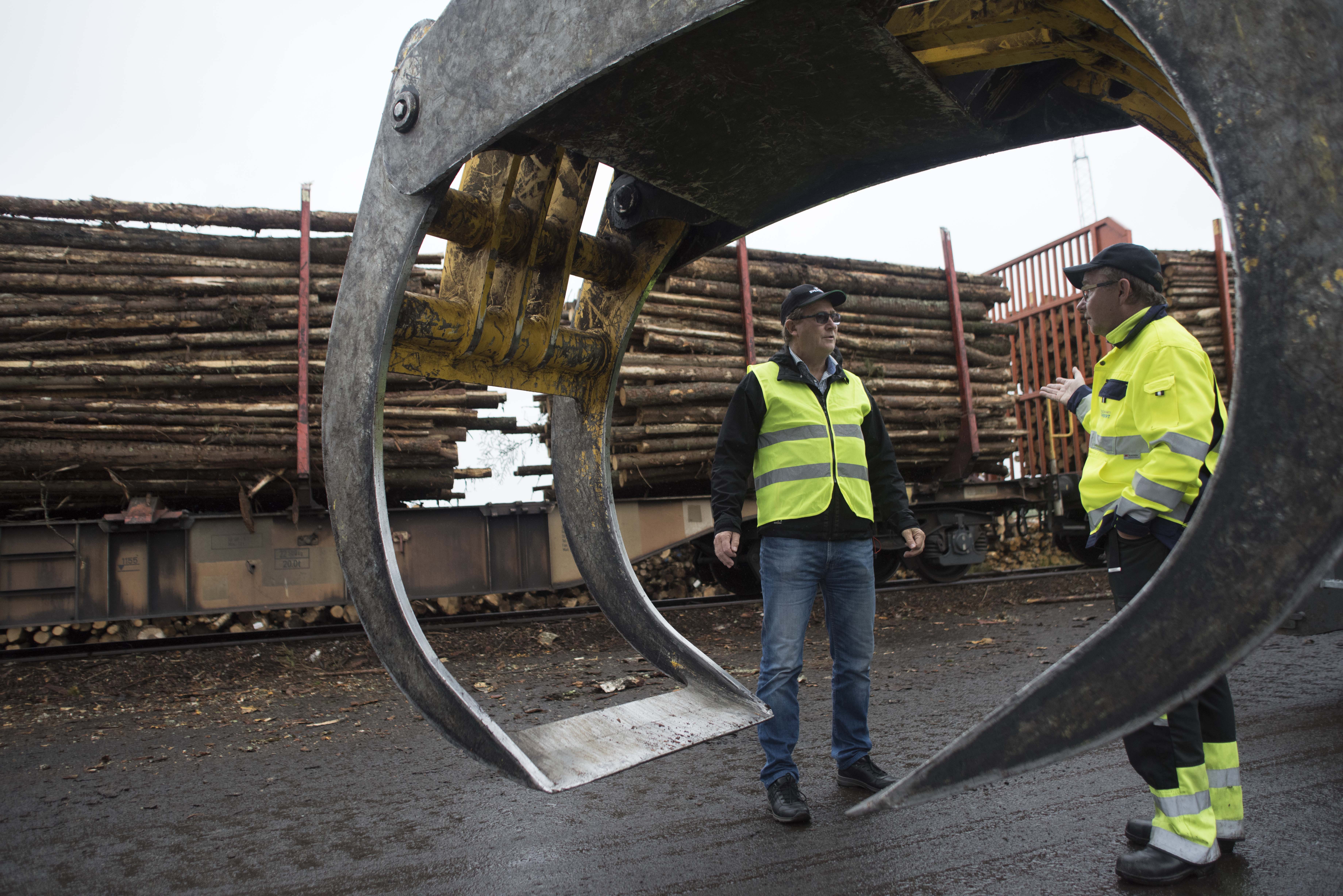 - Beskrivning: Mats Haapala på Stockarydsterminalen AB och Krister Bergman, logistiker på Sveaskog, Tåglast med massaved från Stockaryd till Östrand, sommaren 2018 ska SCA:s nya stora massafabrik stå färdig, för att det ska hända behövs massor av råvara, timmerleverans