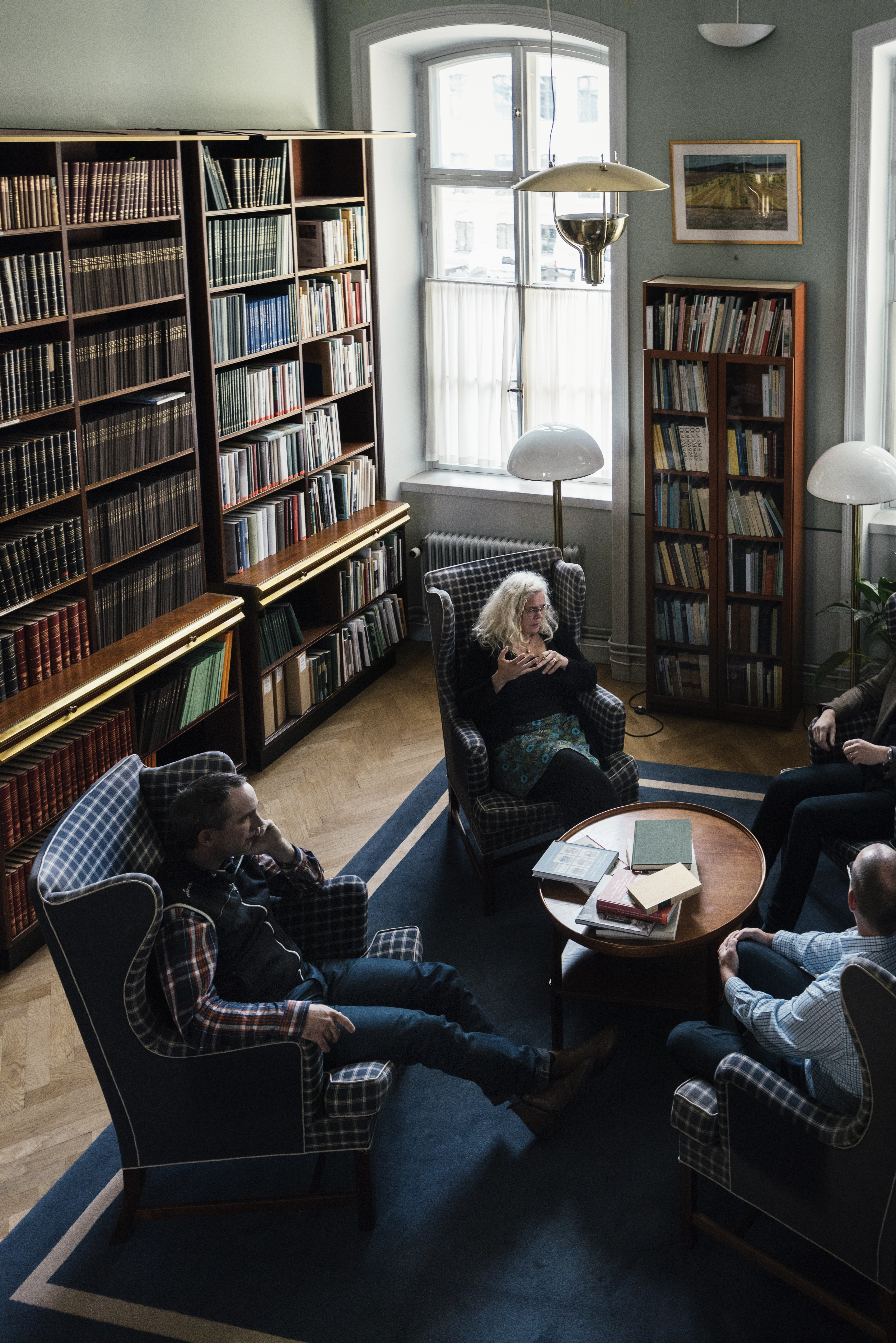 - Beskrivning: Jesper Östensson, Gisela Björse med flera, Bild ovanifrån, Möte om avverkningsberäkningar, samtal, dialog, Lantbruksakademins bibliotek, diskussion om hur arbetet gått, fotöljer