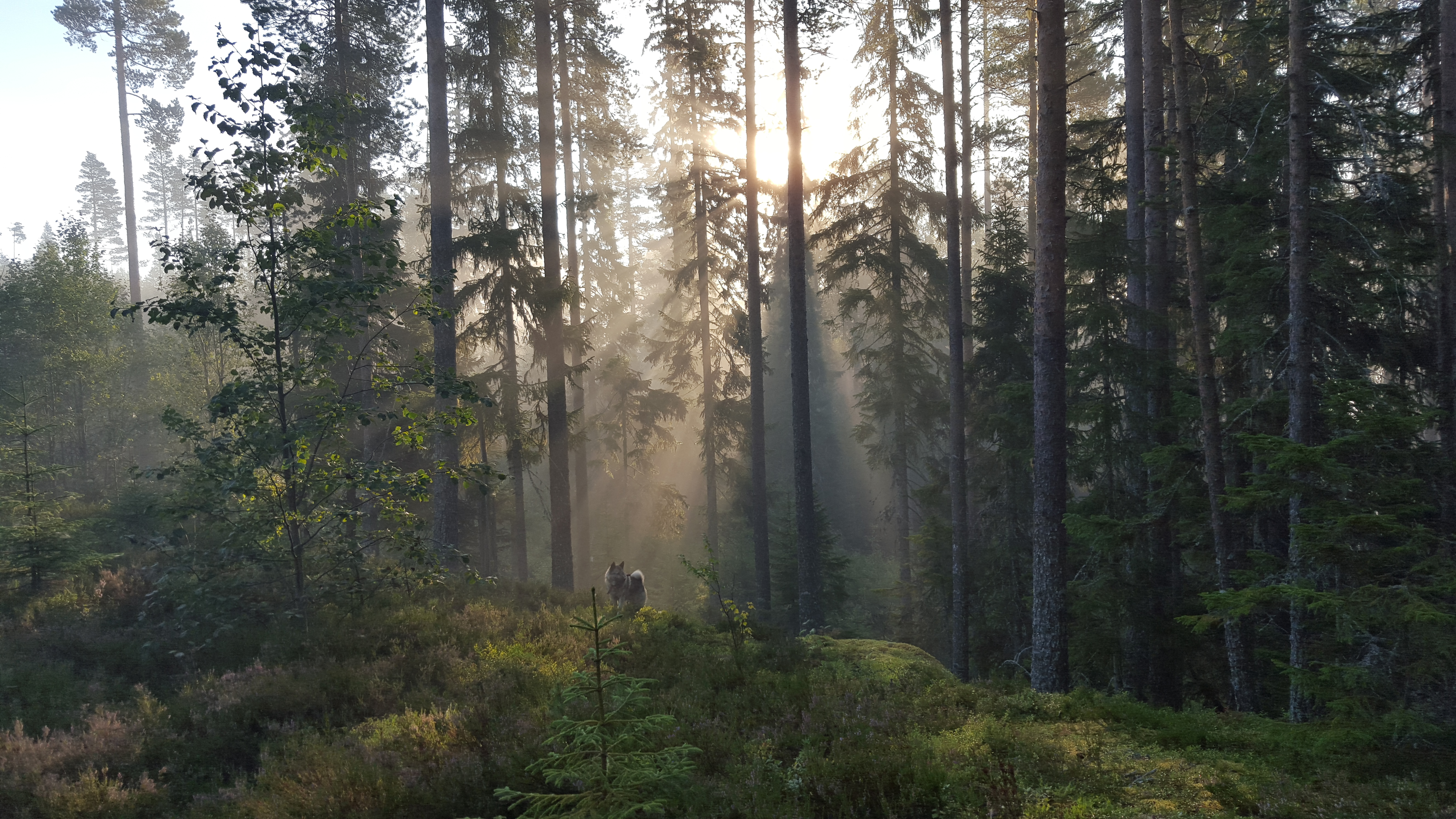 - Beskrivning: Gråhund mellan träden. Gryning. Solljus, dis, glänta. Se bildid 21523 för likadan bild men utan hund.