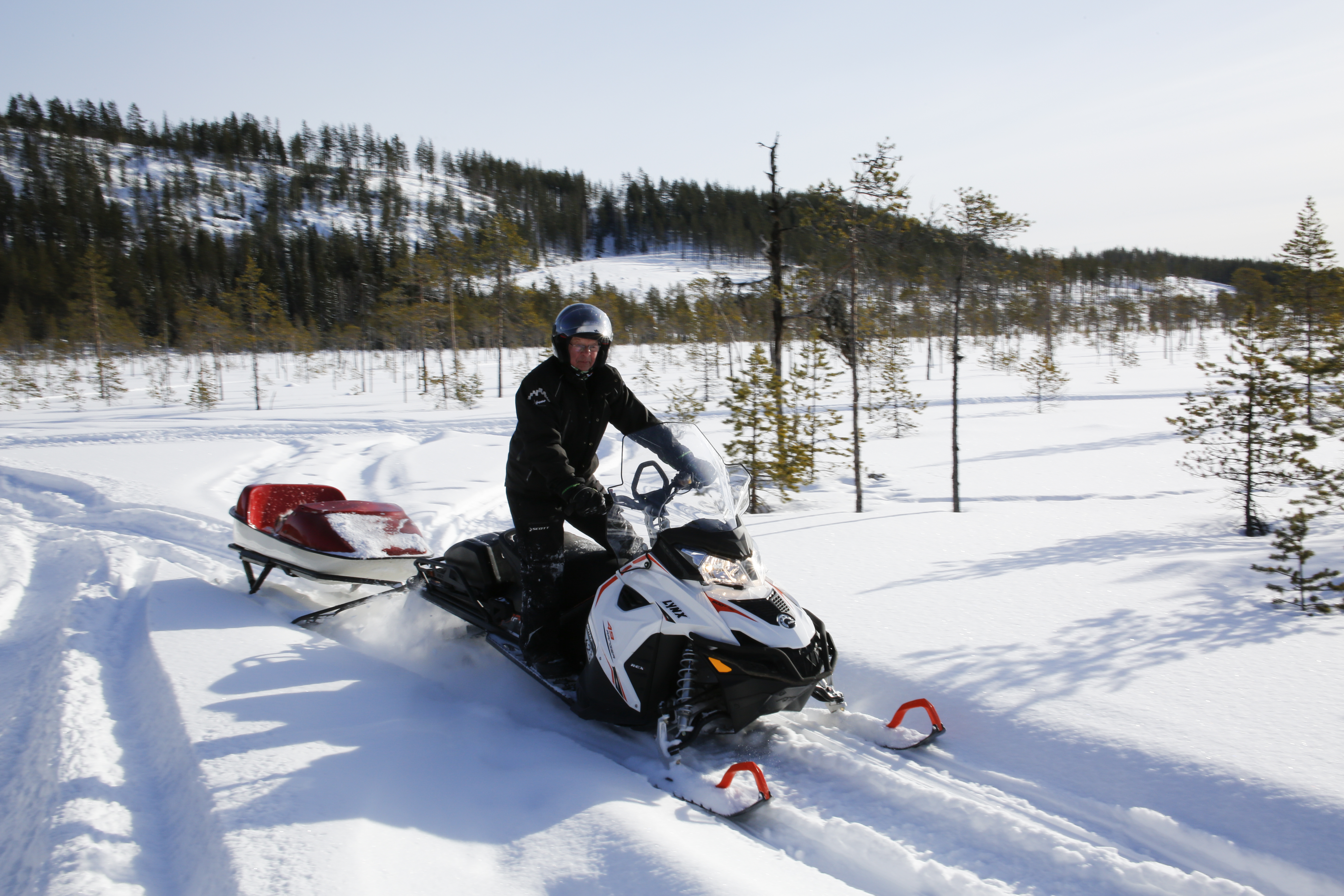 - Beskrivning: Med släde kan man ta med sig ordentligt med mat och fiskeutrustning, Granö Beckasin, exotisk natur i svensk skogsbygd, naturupplevelser i världsklass, på Sveaskogs marker, trädhotell, hotell i träd, hotell