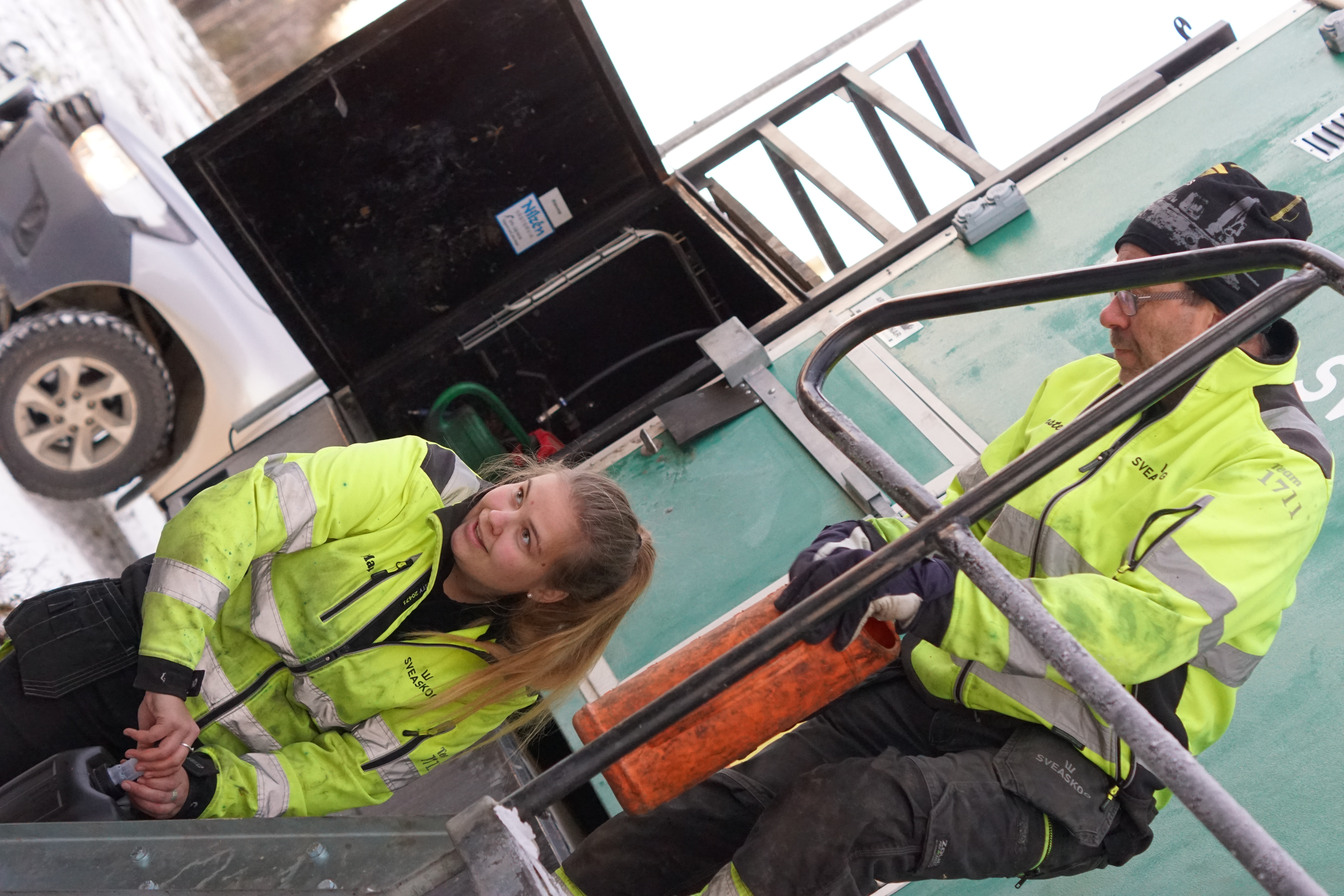 - Beskrivning: Maja Henriksson fyller på bensindunk. Helene Samuelsson besöker MO Nord.