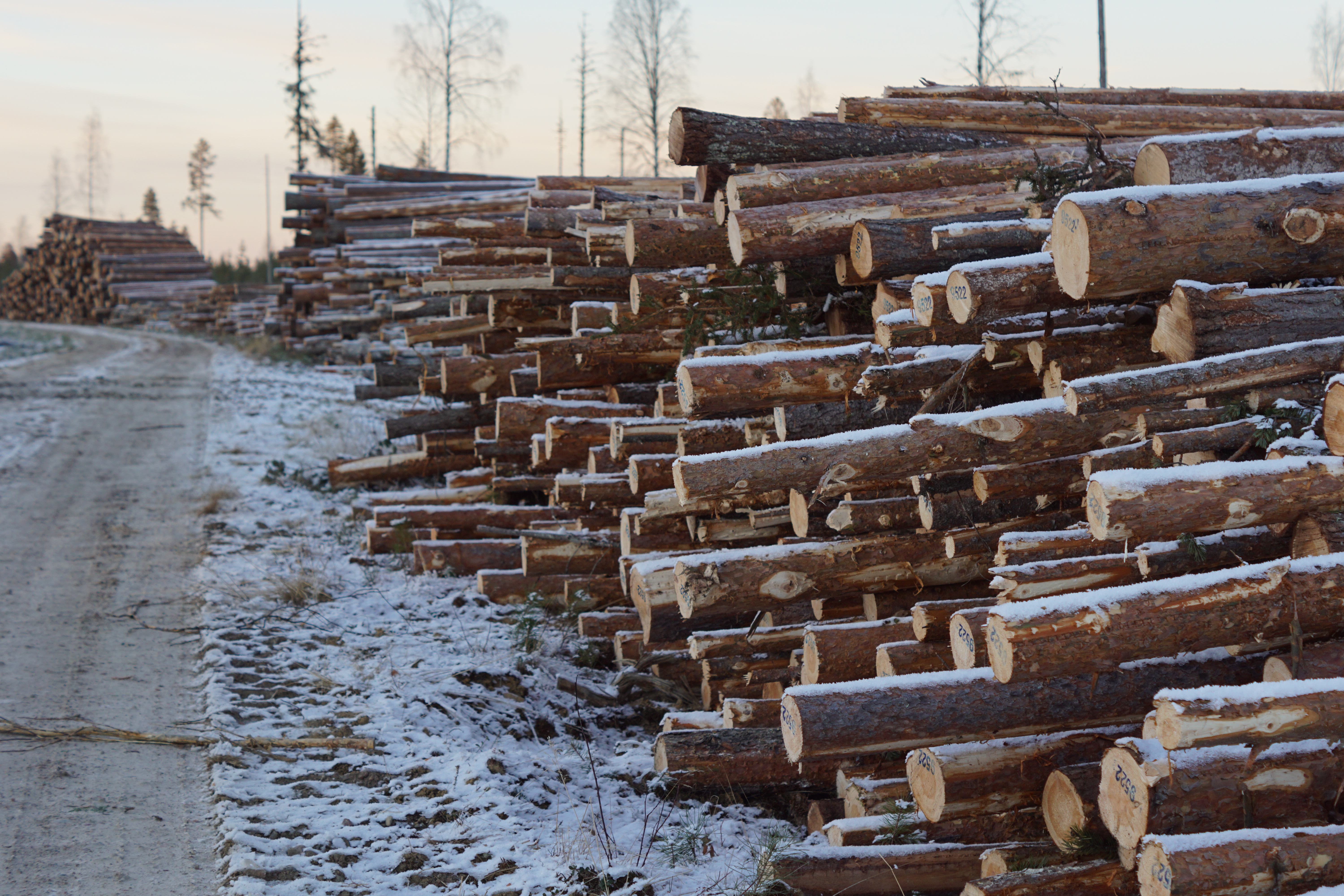 • Beskrivning: Timmervälta, avlägg, stockar, virke, frost