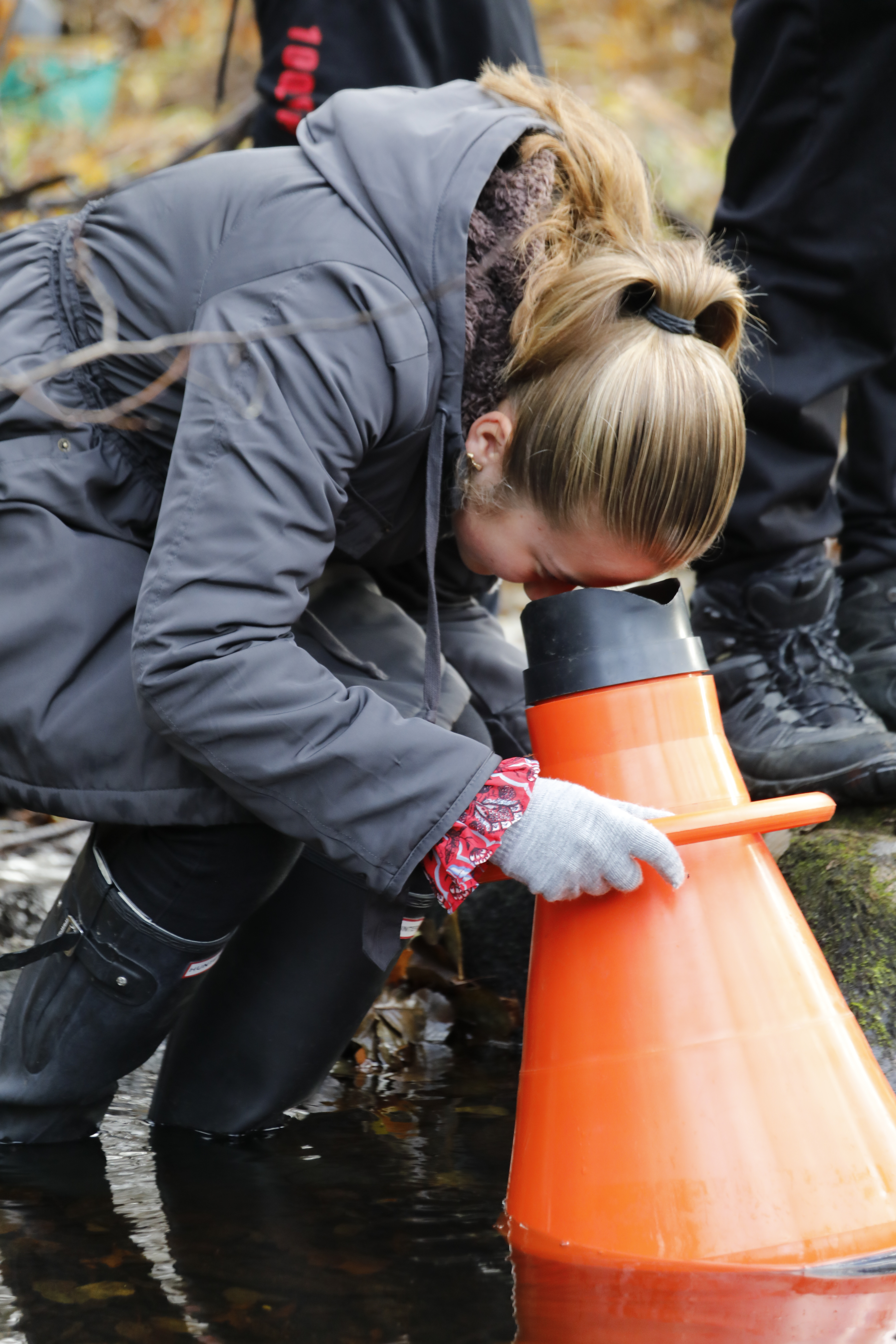 - Beskrivning: Louise Hedström använder vattenkikaren för att se vad som simmar kring hennes fötter. Kikare.