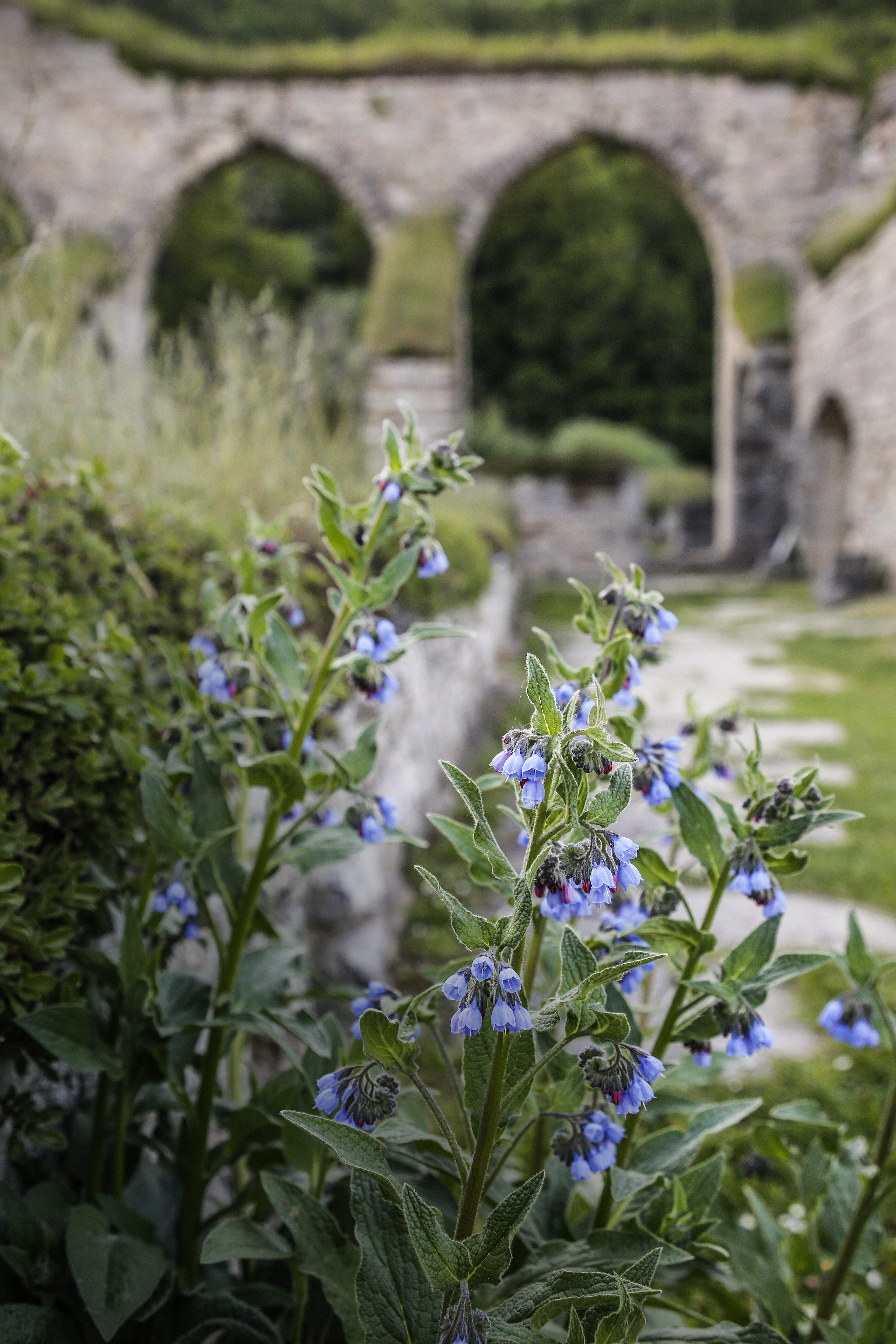 - Beskrivning: Forum Sveaskog, blåa blommor, växter, kloster, gård