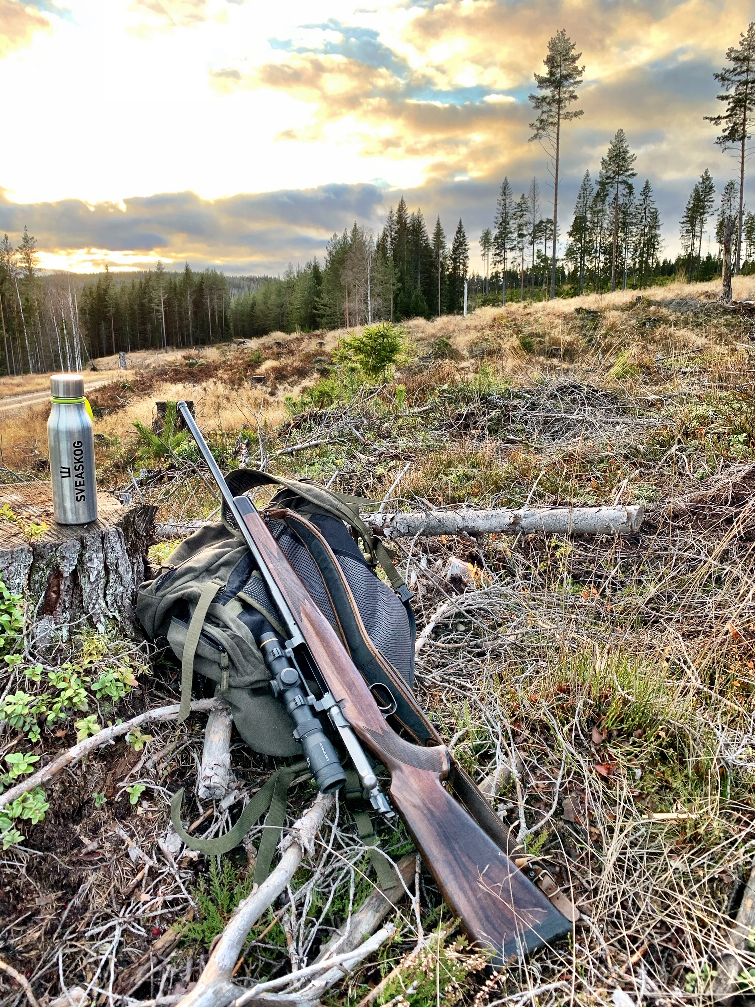 - Beskrivning: Jakt pågår, bössa, gevär, jaktutrustning, termos, kaffe, fika, på passet, Sveaskogs logotyp