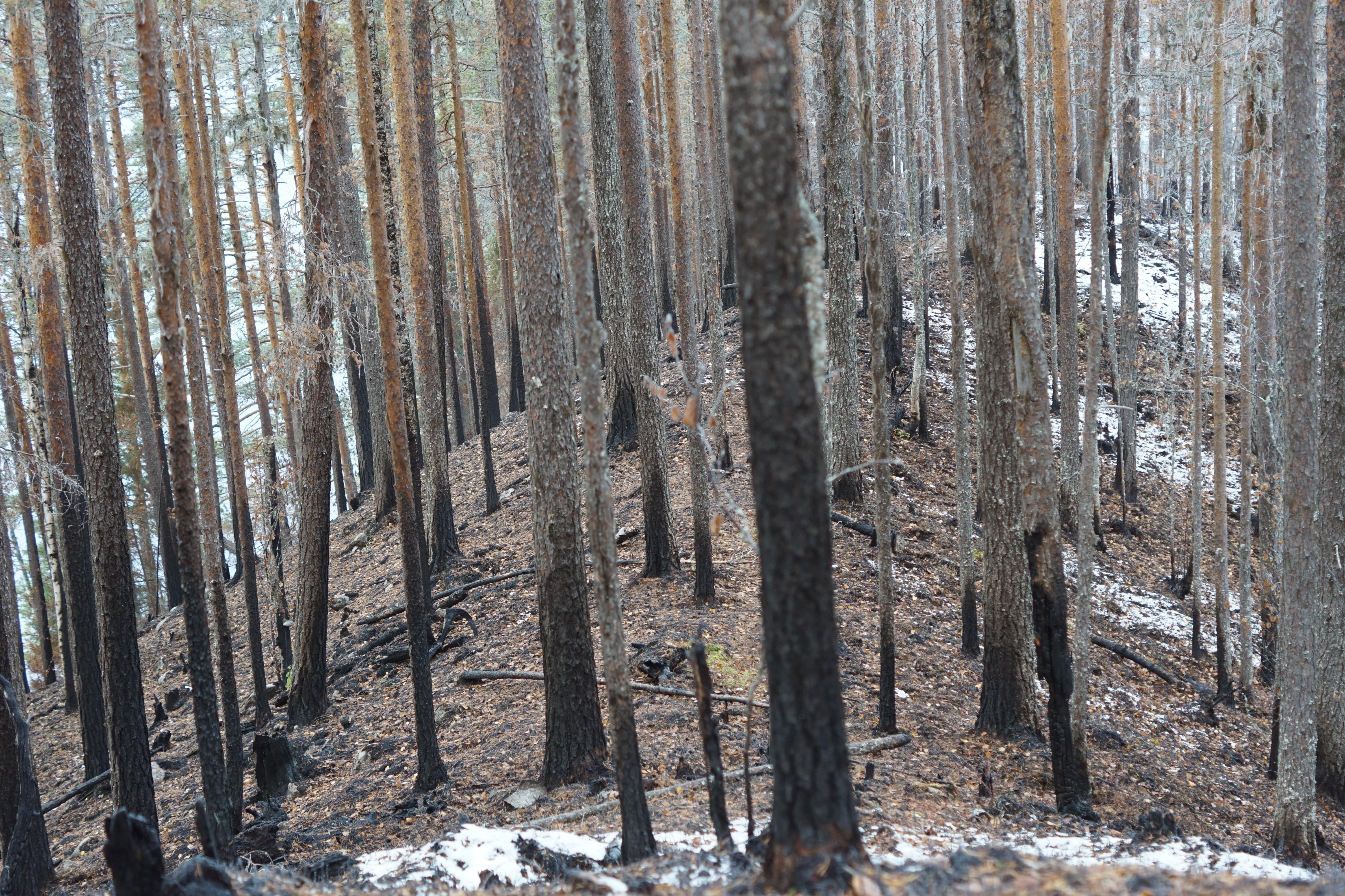 - Beskrivning: Naturvårdsbränning i Ekopark Käringberget, träd, kala träd, brand, ekopark, rullstensås