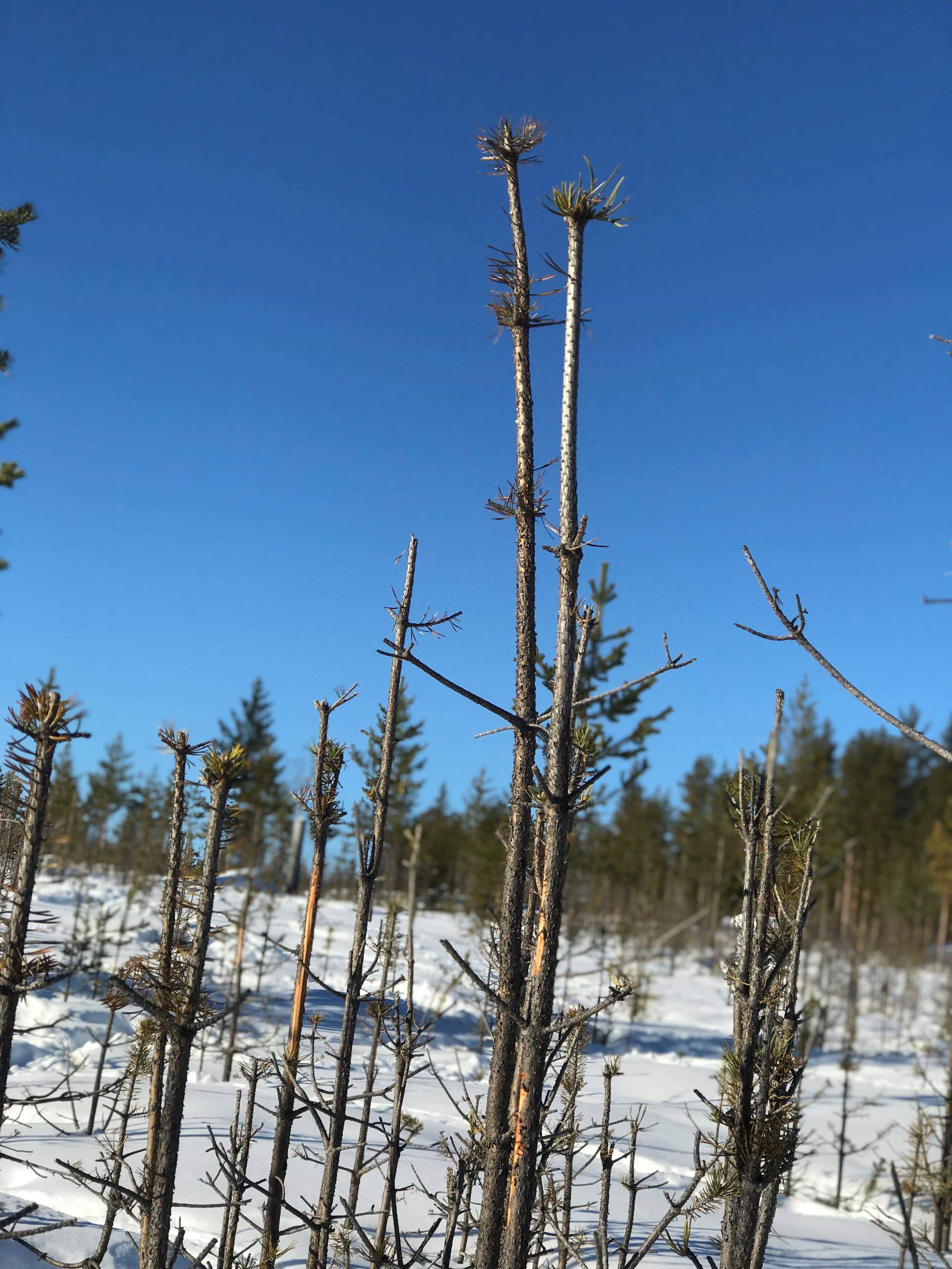 - Beskrivning: Älgbetad tall, betesskador, tall, tallungskog, blå himmel, snö