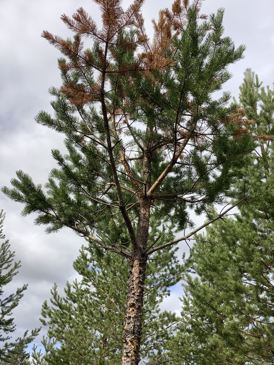- Beskrivning: Törskate, törskateangrepp, svampskador, tall tallungskog, bruna grenar, grön topp, barr