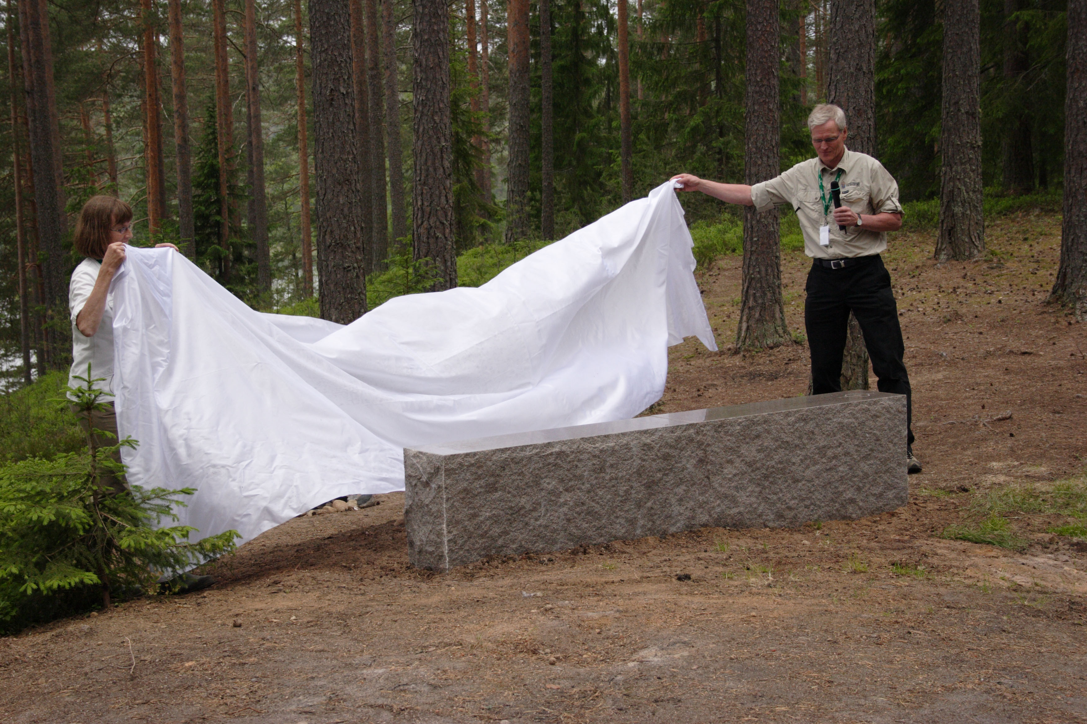 - Beskrivning: Ekopark Malingsbo, invigning. Avtäckning av stenbänken.