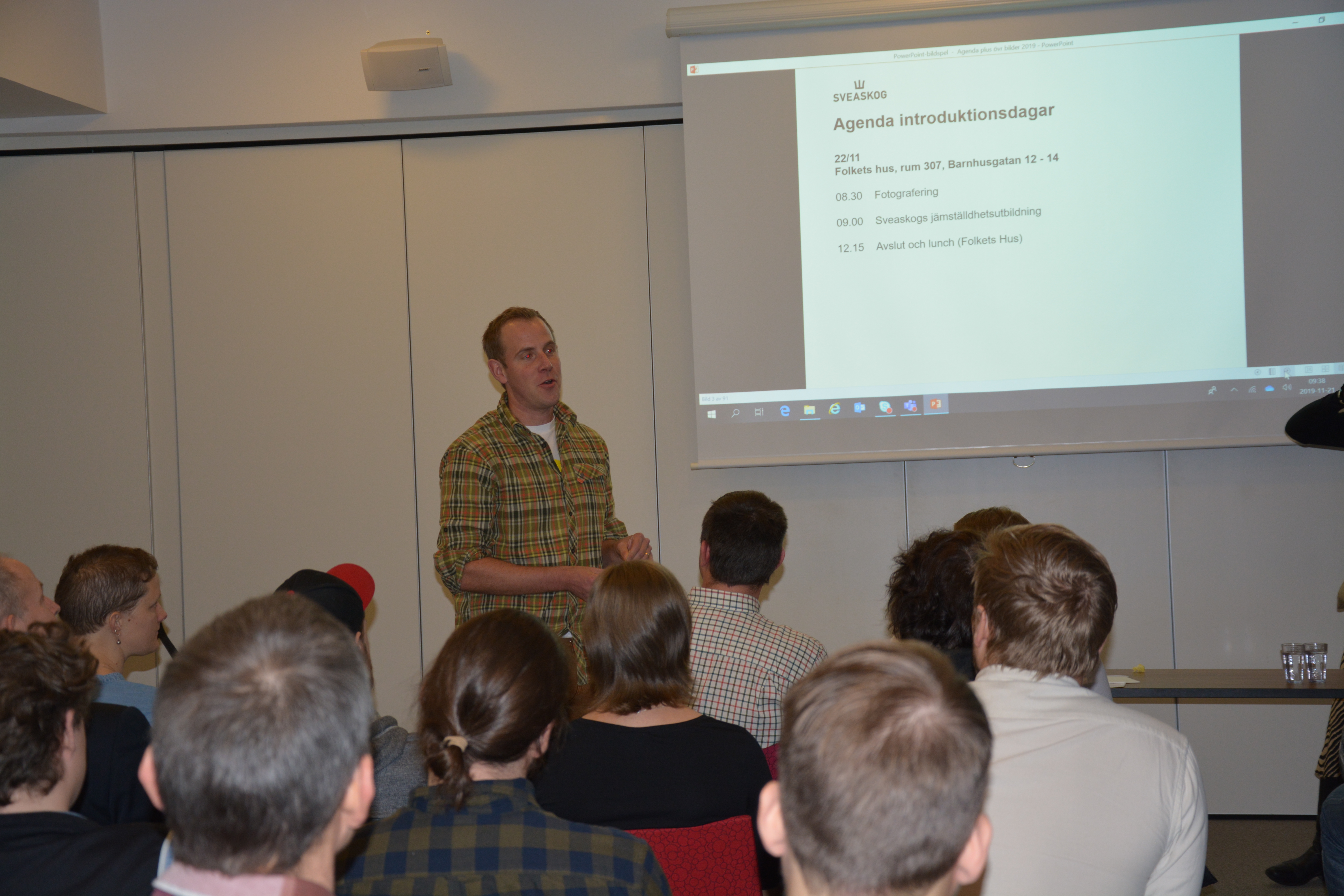 - Beskrivning: En gång om året bjuder Sveaskog in alla nyanställda till introduktionsdagar i Stockholm, Anton Sjödin, kundansvarig, pratar, föredrag, presentation, medarbetare lyssnar, intresse