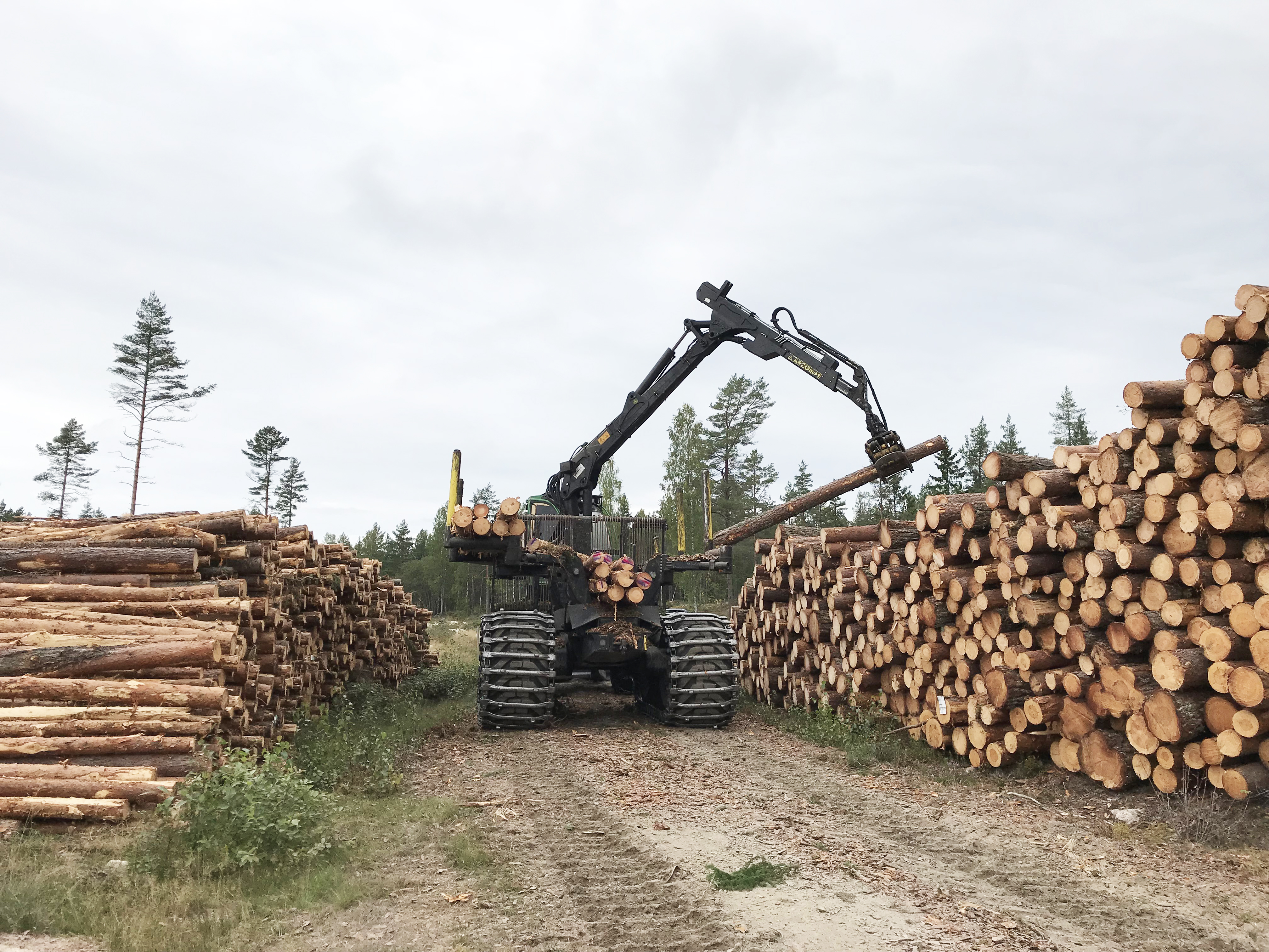 • Beskrivning: Skotare, avverkning, lastar timmer, stockar, virkesupplägg