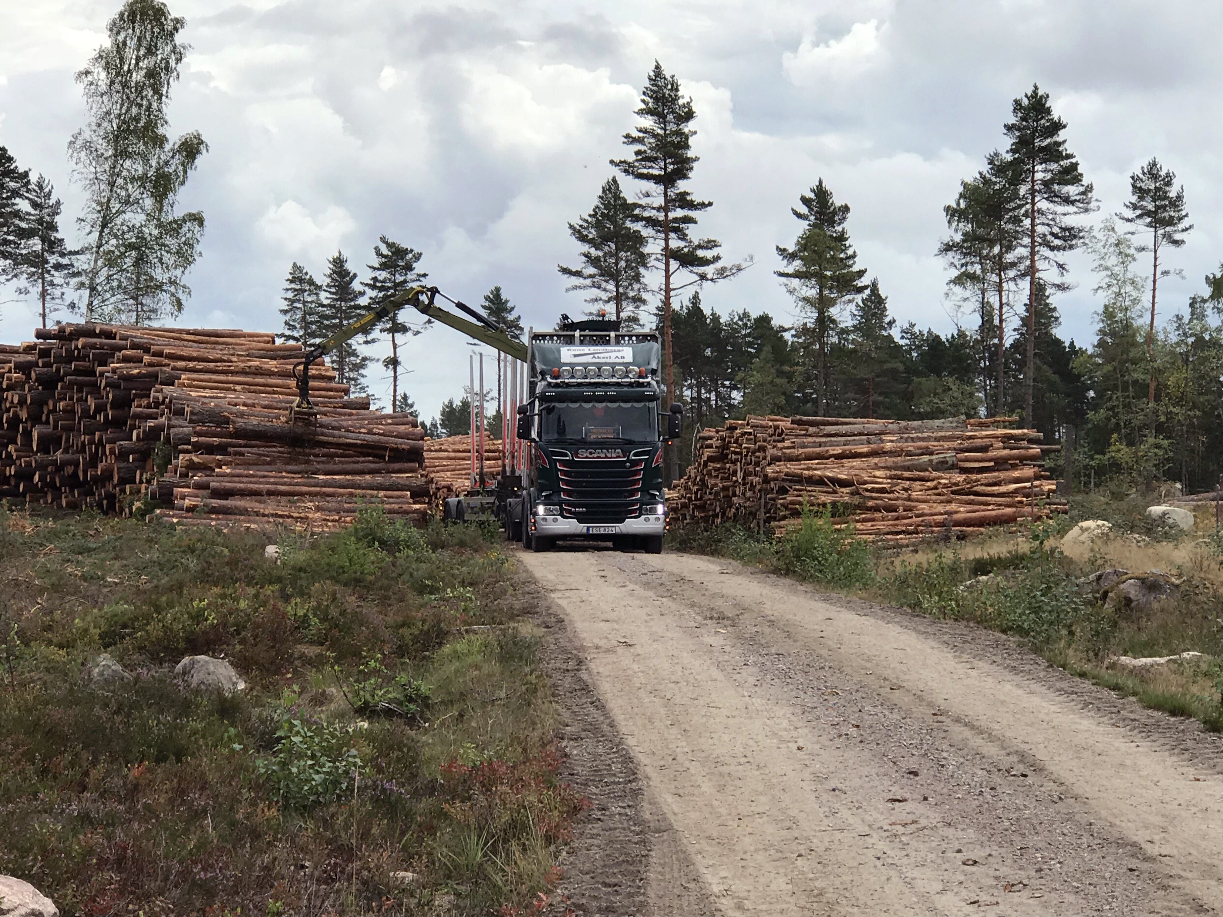 - Beskrivning: Lastning på timmerbil, Skultuna, Norra Bergslagen. Transport, åkeri, entreprenör, timmer, logistik, virke, rundvirke, lastbil, virkesupplägg, timmertrave, skogsbilväg