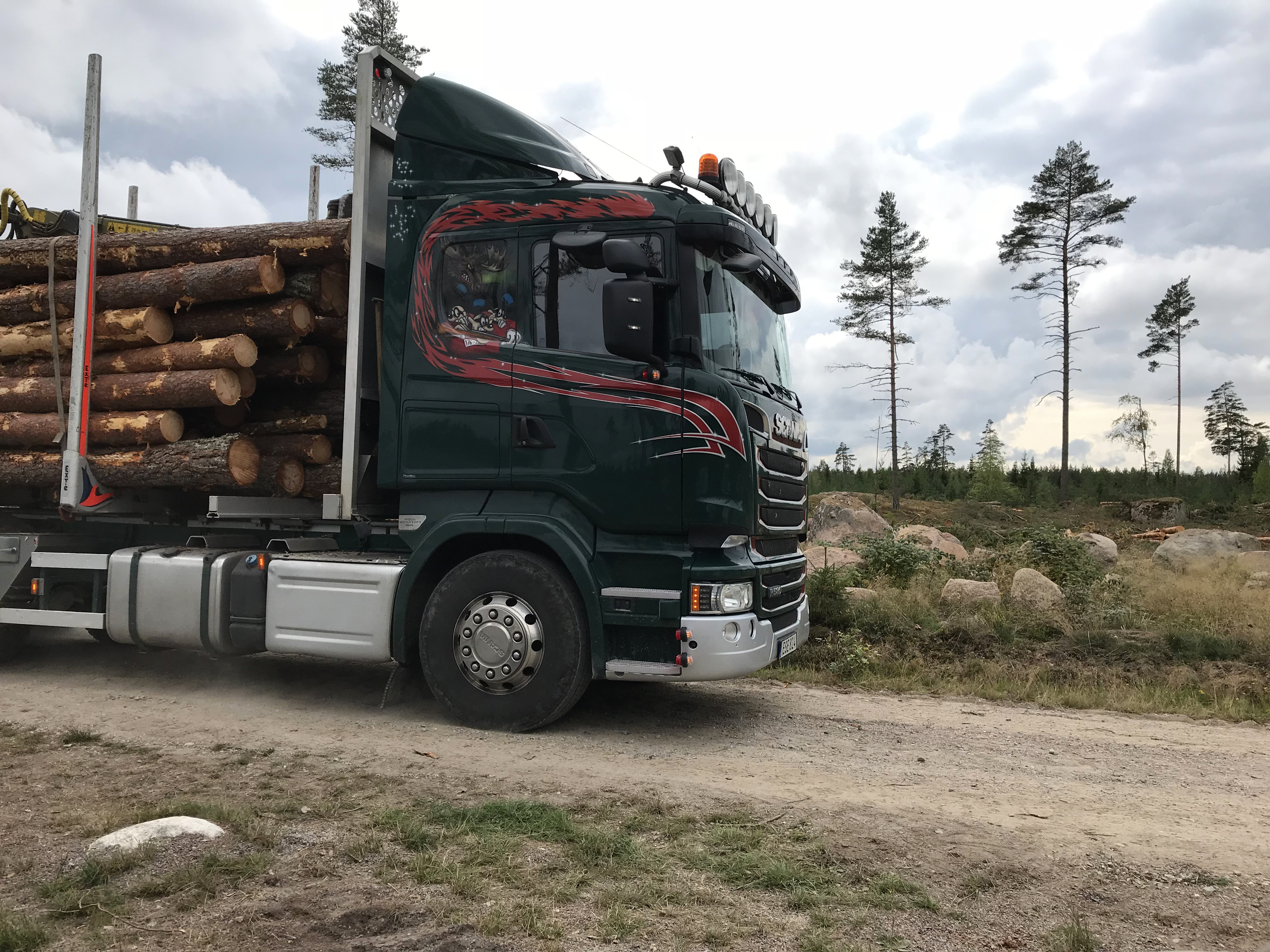 - Beskrivning: Lastning på timmerbil, Skultuna, Norra Bergslagen. Transport, åkeri, entreprenör, timmer, logistik, virke, rundvirke, lastbil, virkesupplägg