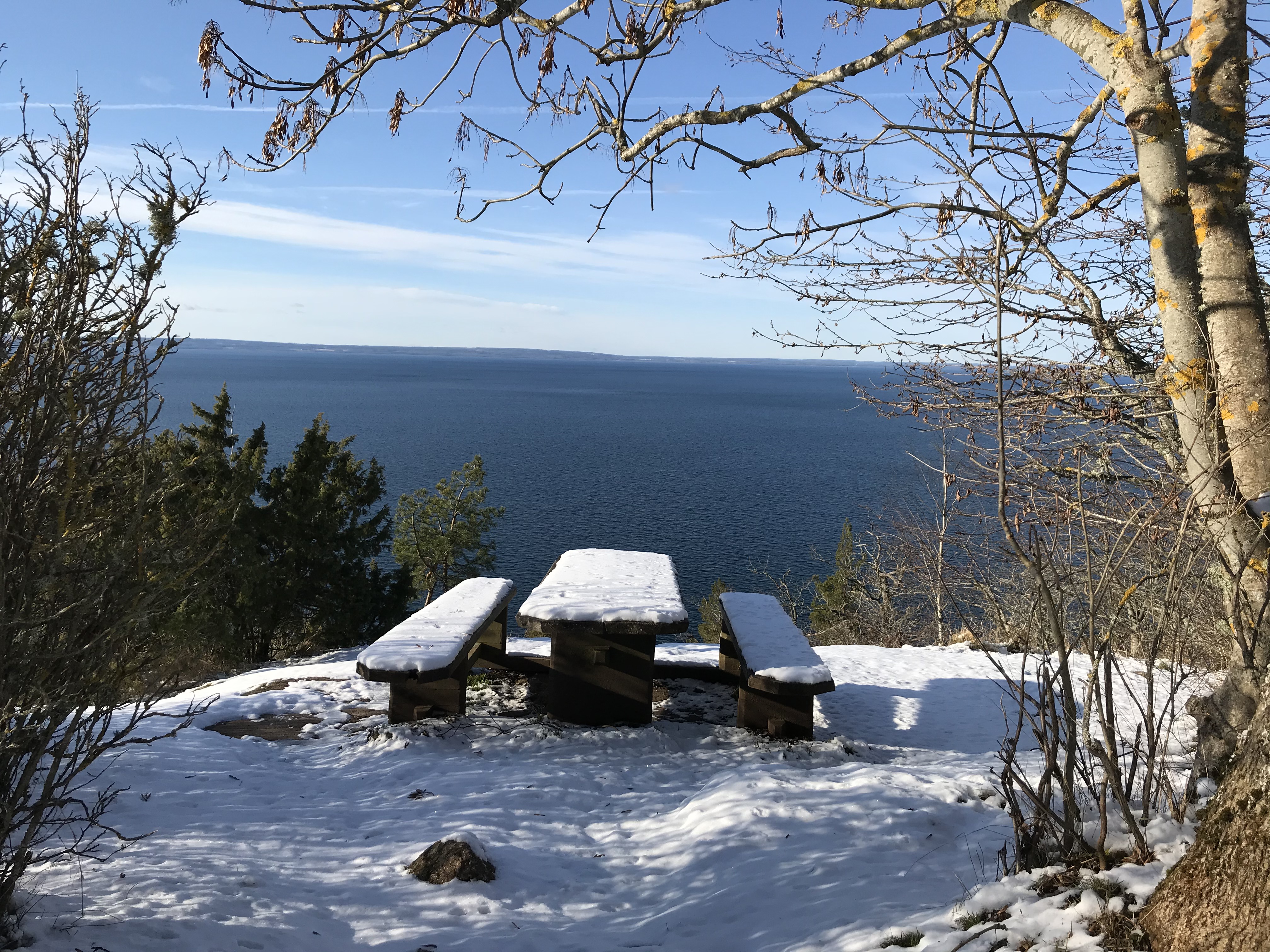 - Beskrivning: Fantastiskt fint även på vintern, fina rastplatser, vindskydd och grillplatser finns året om, rastplats vid Pers Sten, ekopark Omberg, äntligen lite snö även i södra Sverige, vatten, himmel, moln, vårvinter, träd, utsikt, bänk, sol, Vättern