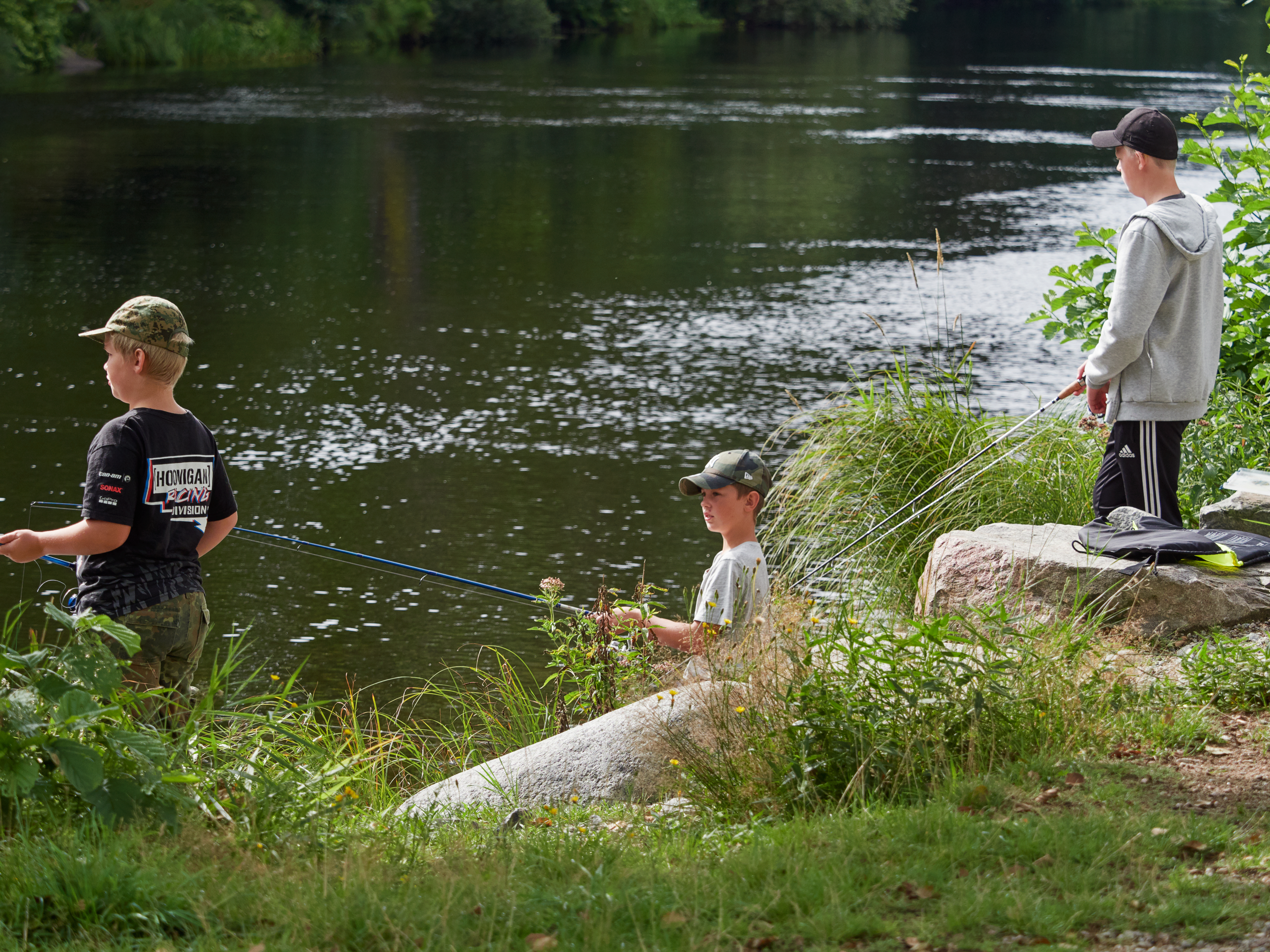 - Beskrivning: En gång om året anordnar Sveaskog en ungdomsdag i Mörrum för fiskeintresserade ungdomar. Barn, vattendrag, fiske, fiskare, fiskespö, vass, stenar