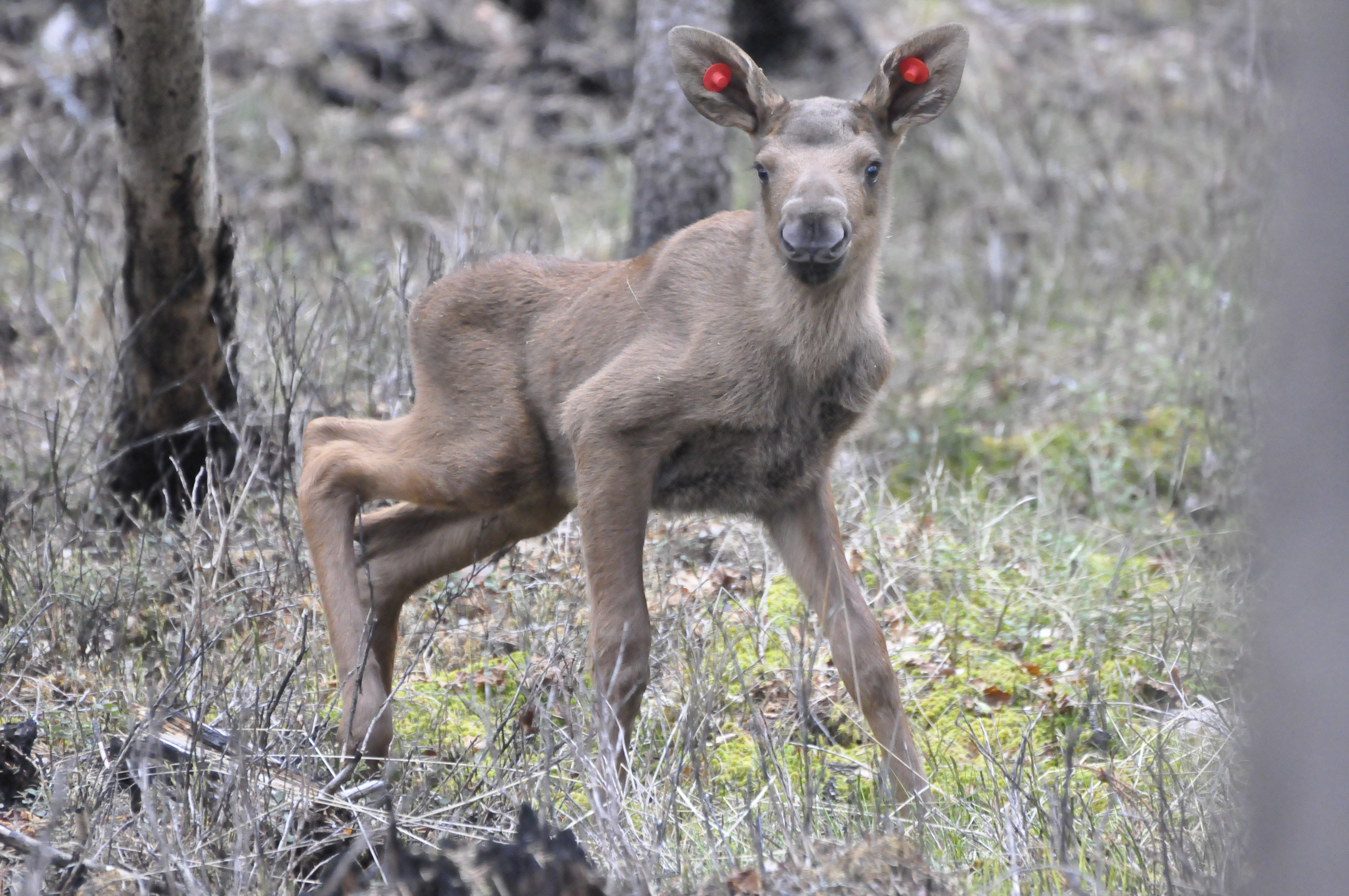 - Beskrivning: Älgkalv, märkt inom forskningsprojekt