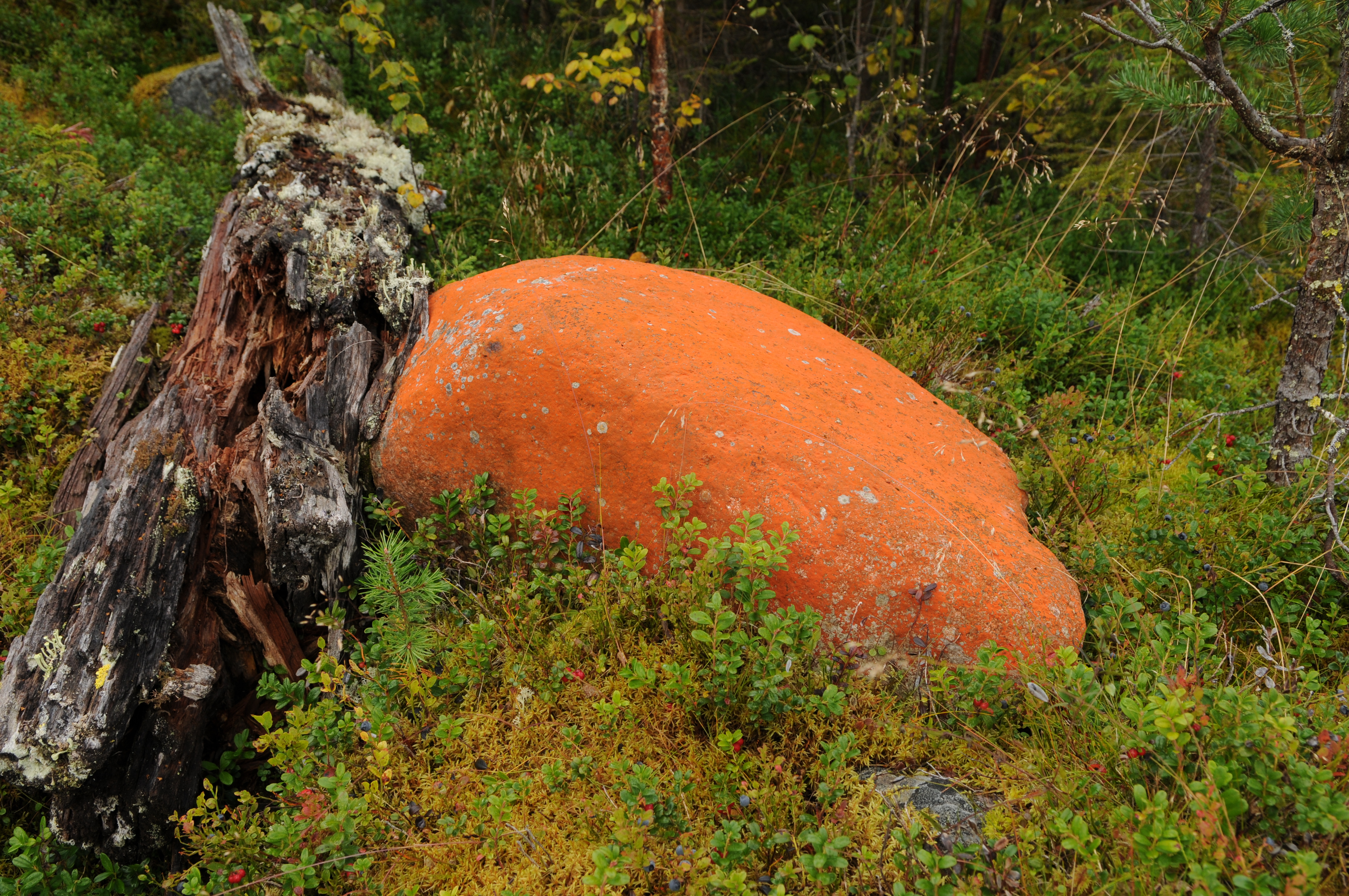 - Beskrivning: Orangeröd sten, markerar vandringsled i Ekopark Jovan
