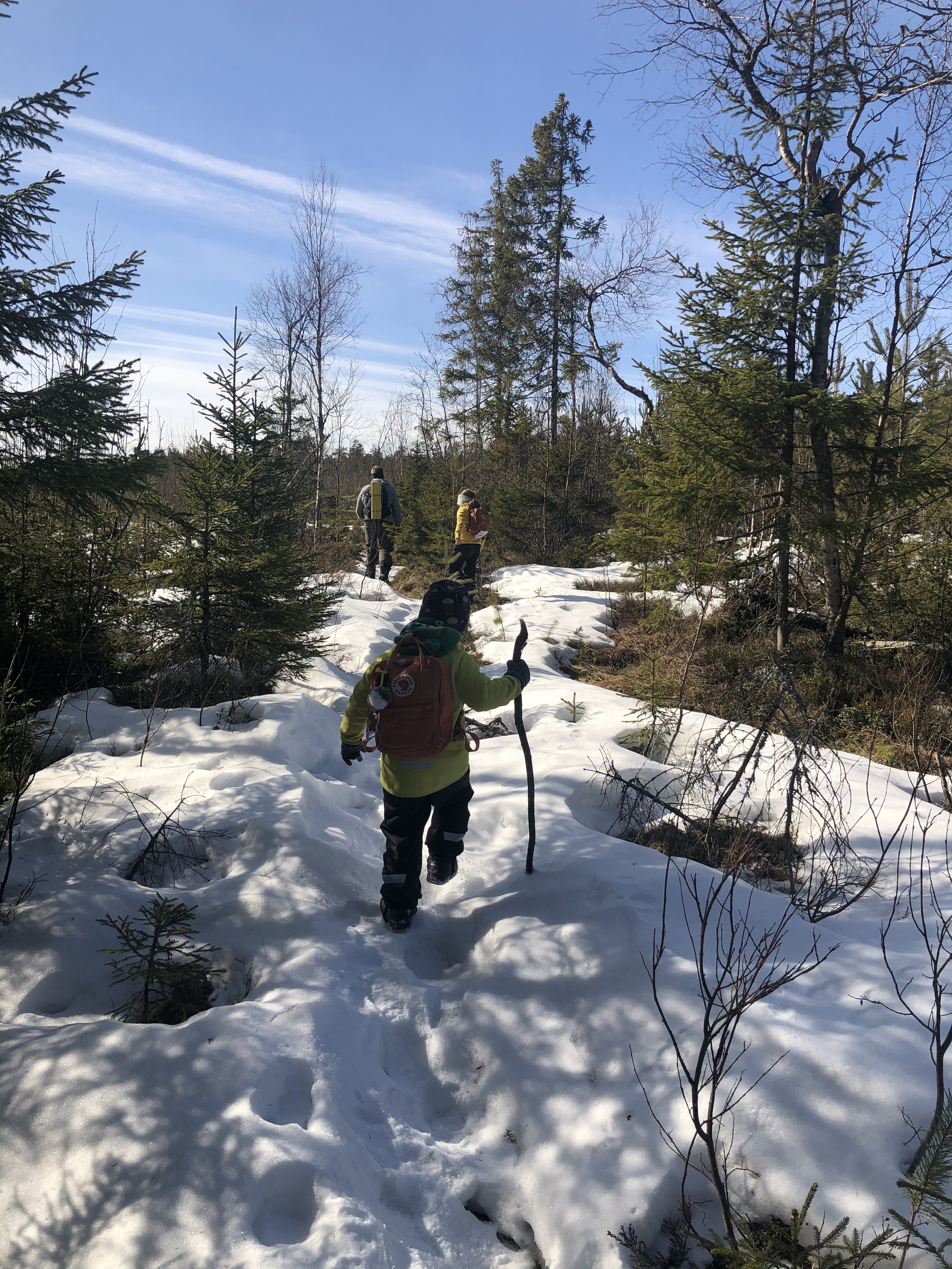 - Beskrivning: Familj promenerar på skaren, vårvinter i Västerbotten, utflykt
