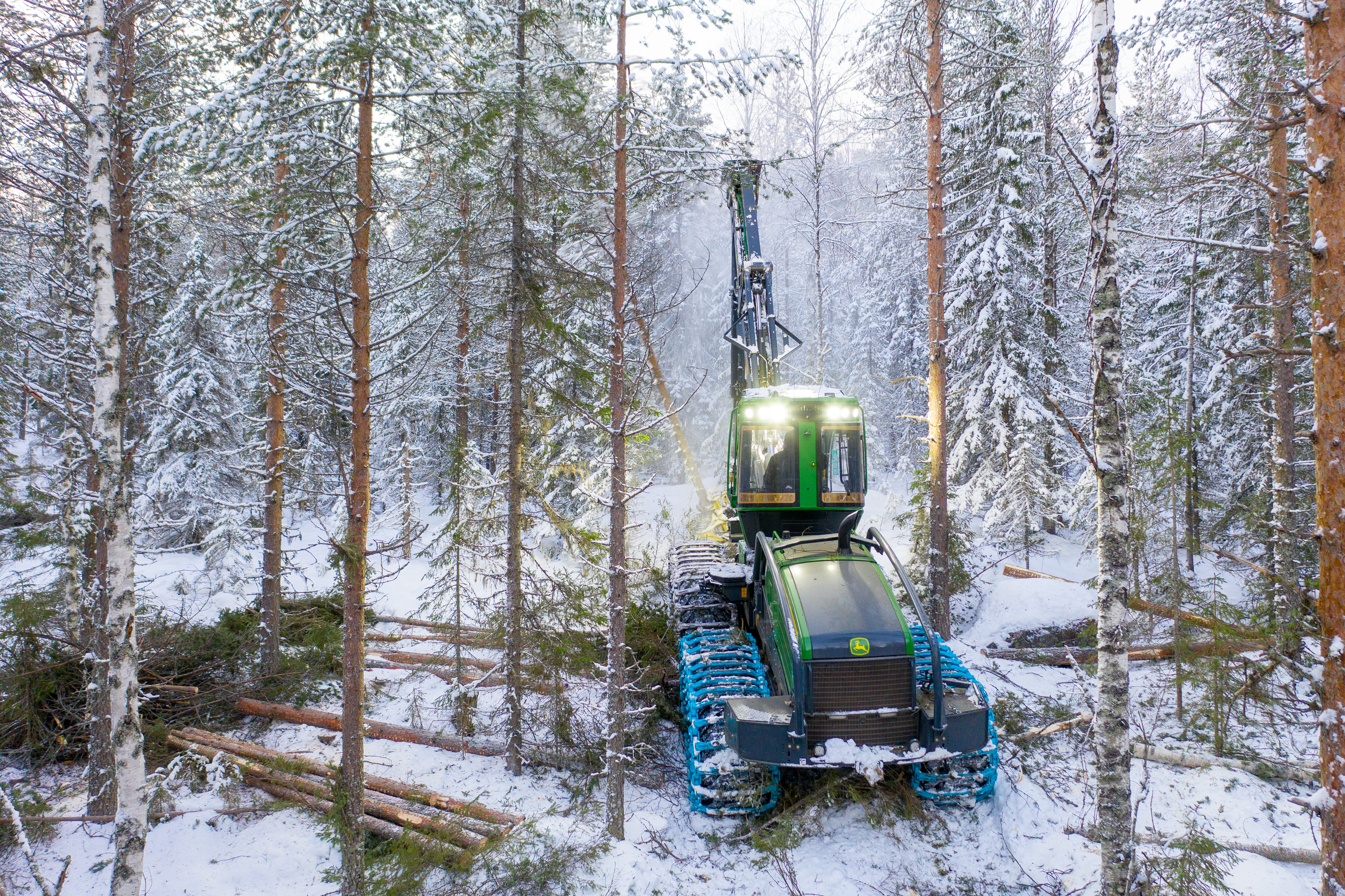 - Beskrivning: Maskinlag i MO Nord, Norrbotten, avverkningslag, avverkning, timmer, virke, skogsbilväg, skogsmaskin, skotare, snö, vinter, avlägg, välta, drönarbild, flygbild, från ovan