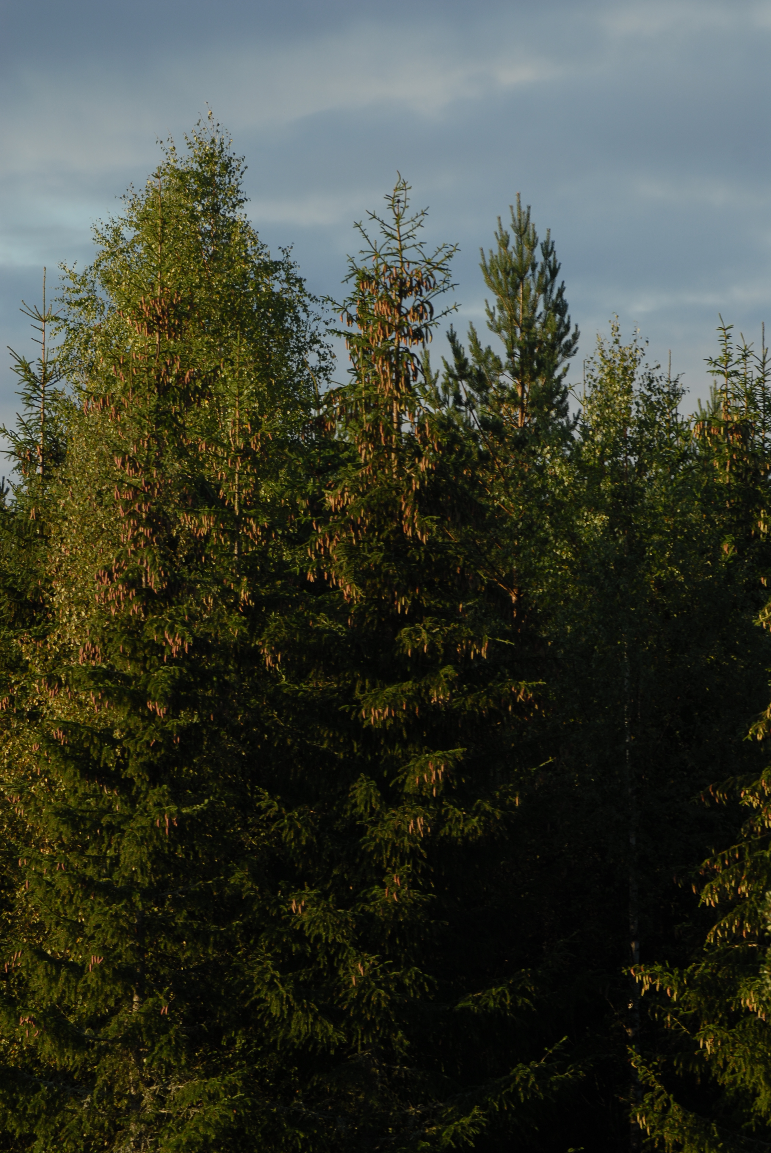 - Beskrivning: Tät blandskog, barr och löv, gran, tall, björk