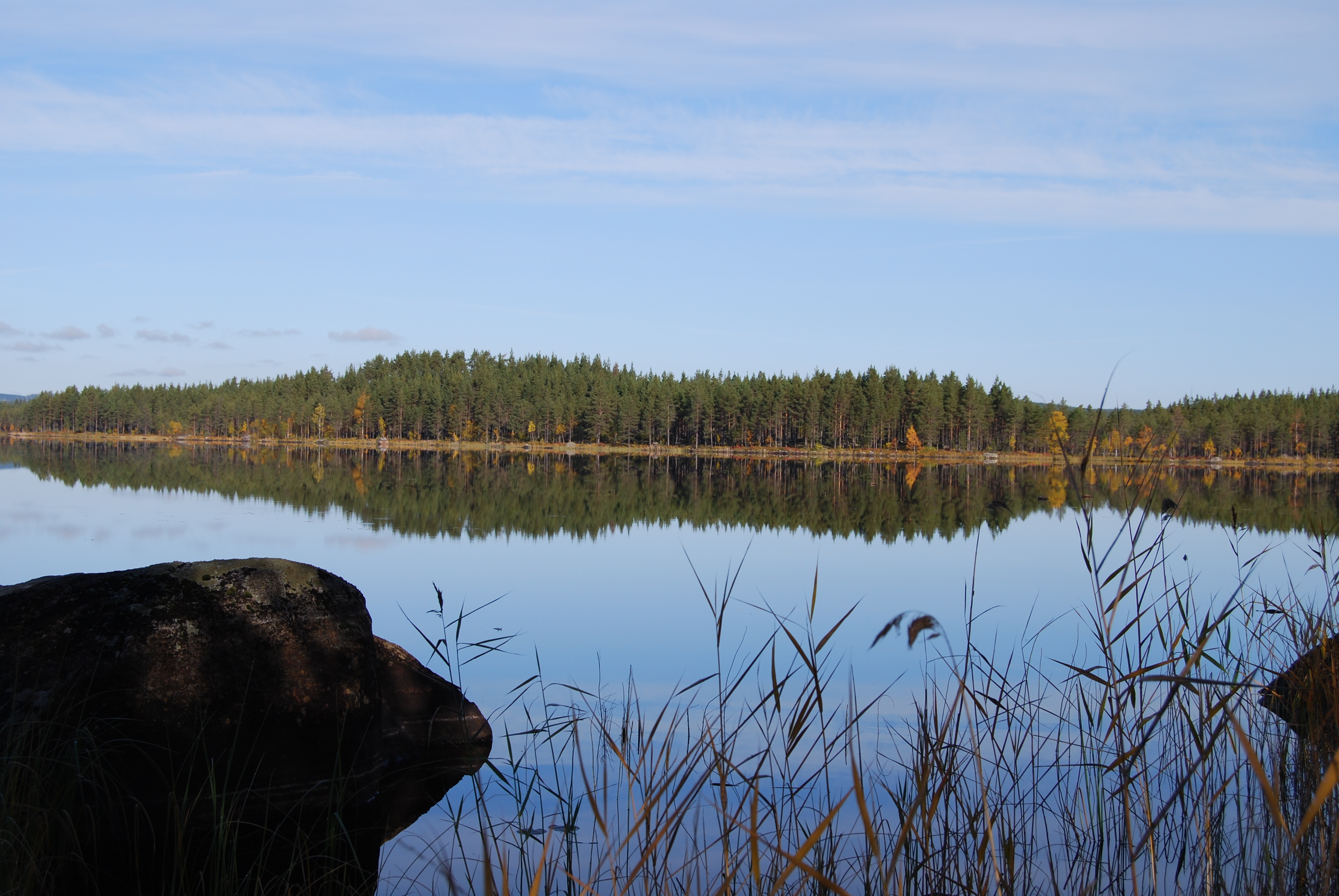 • Beskrivning: Grundaspen, höstdag. Spegelblankt vatten.