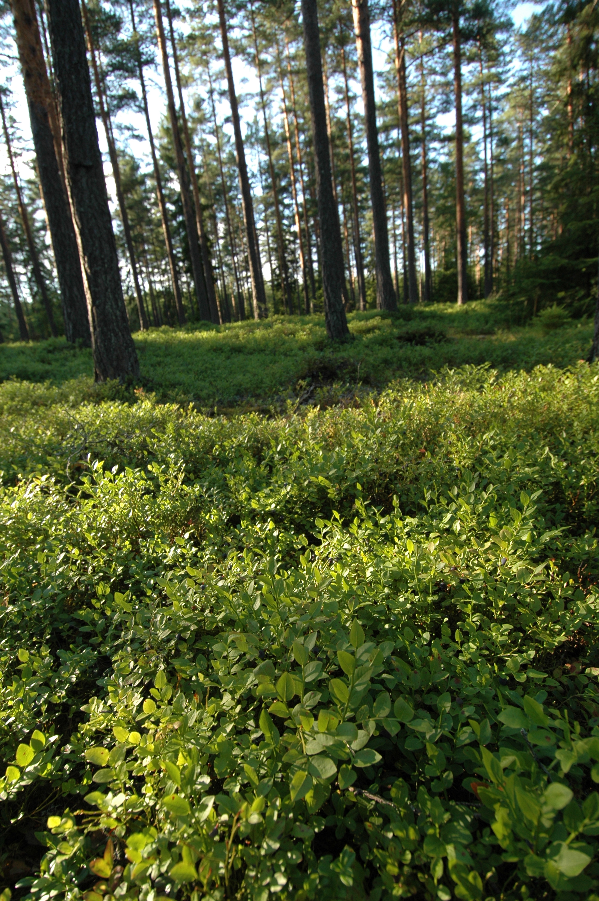 - Beskrivning: Blåbär, blåbärsris, tät undervegetation i tallskog