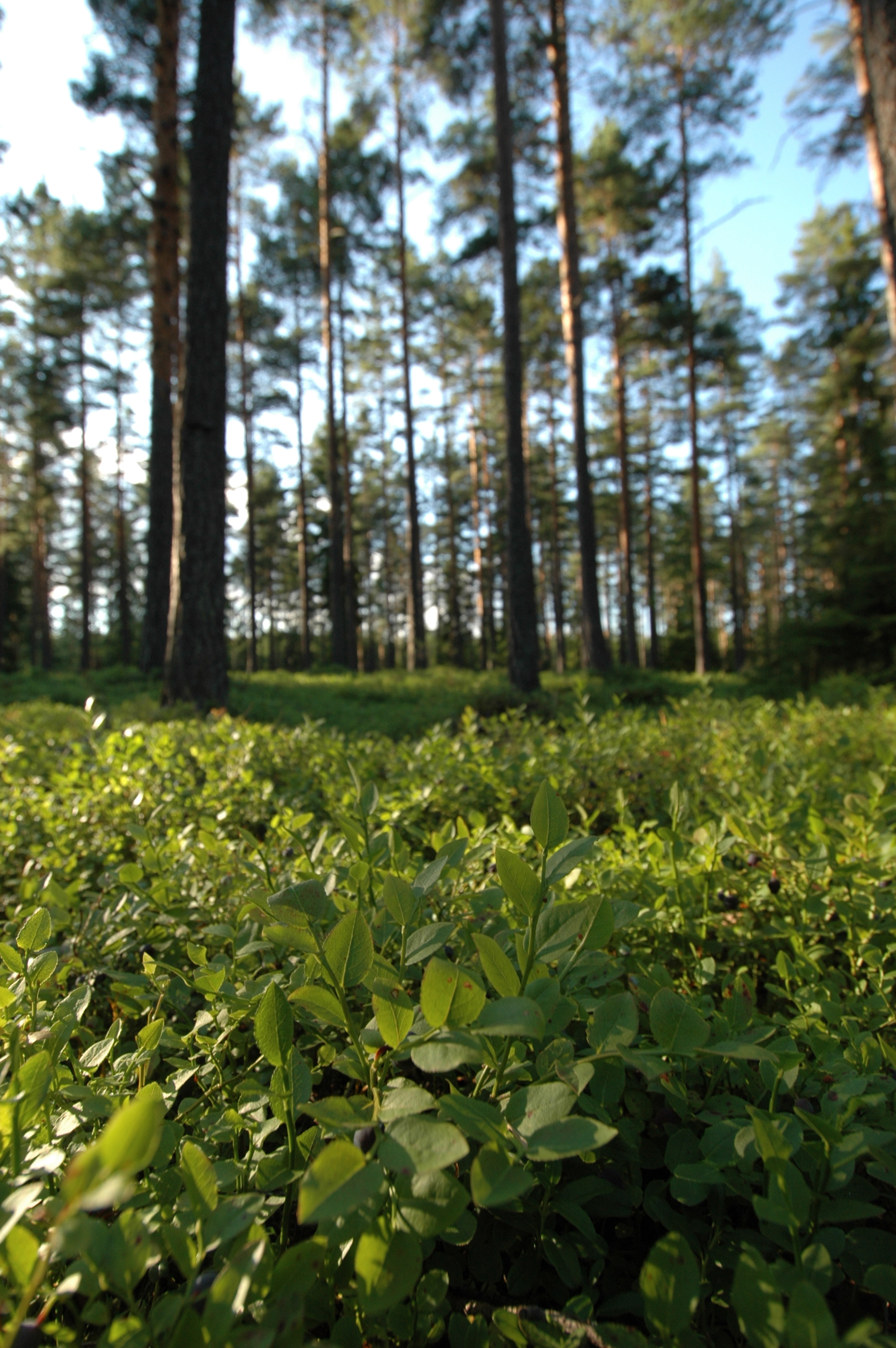 - Beskrivning: Blåbär, blåbärsris, tät undervegetation i tallskog