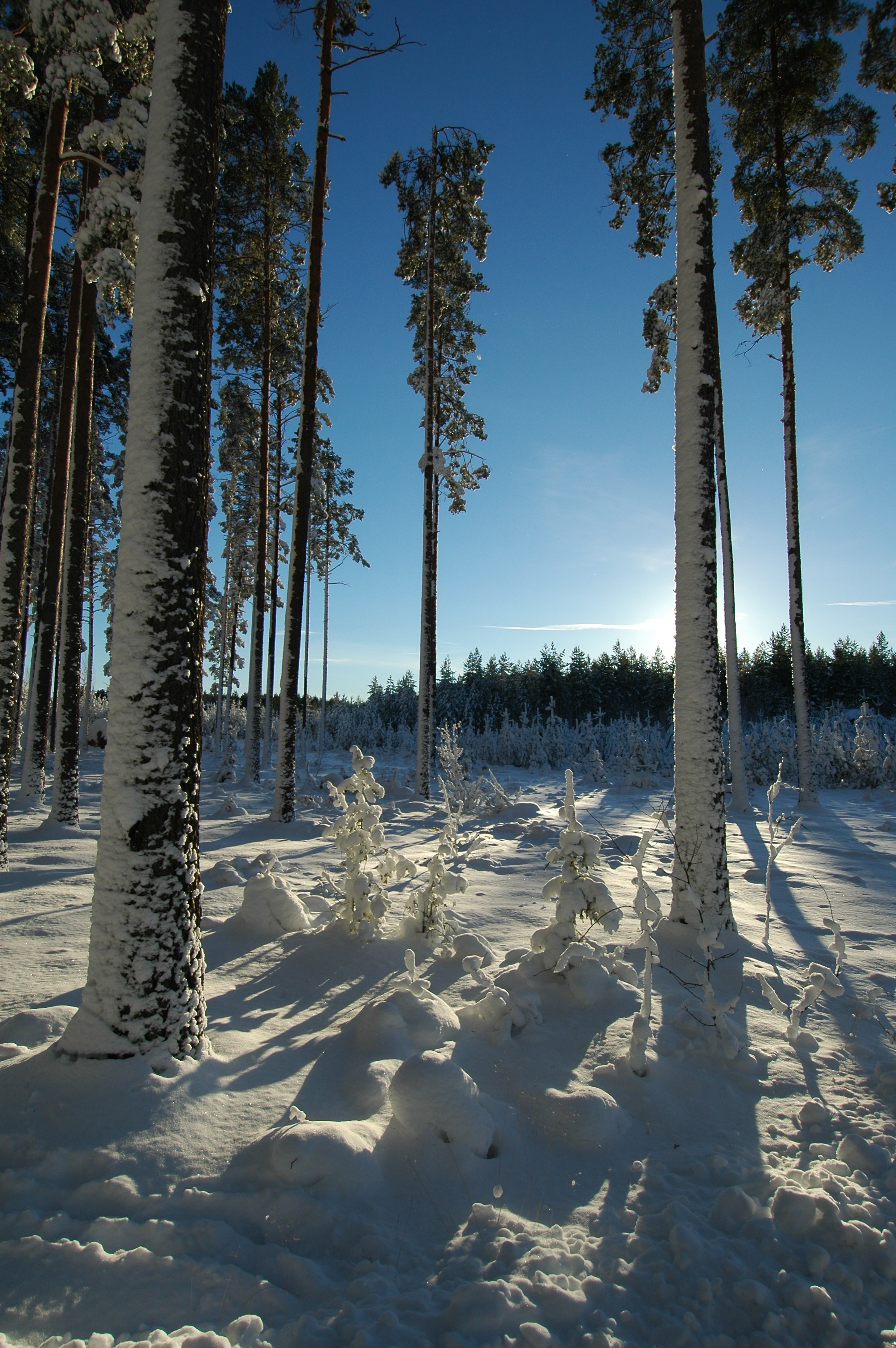 - Beskrivning: Gnistrande solig vinter, tallar efter snöfall