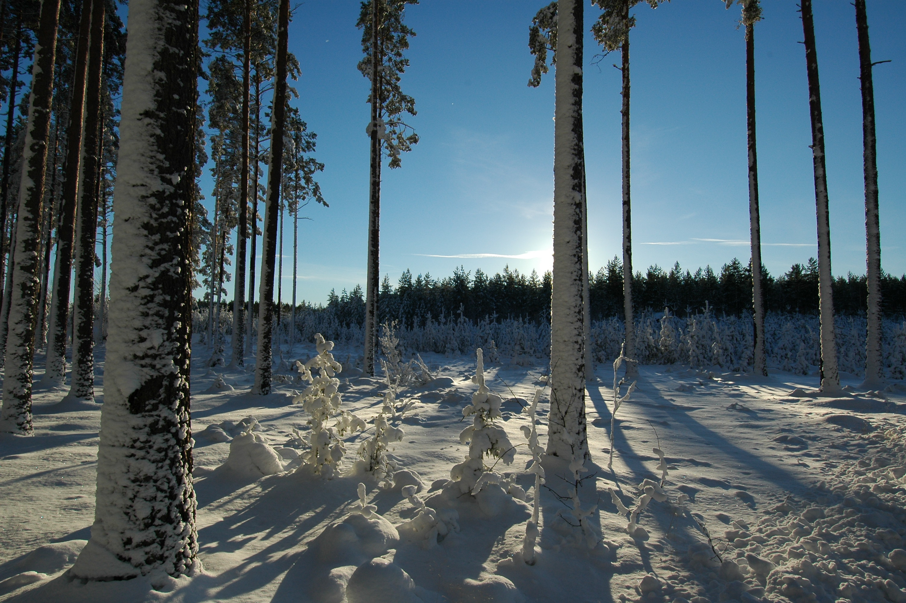 - Beskrivning: Gnistrande solig vinter, tallar efter snöfall