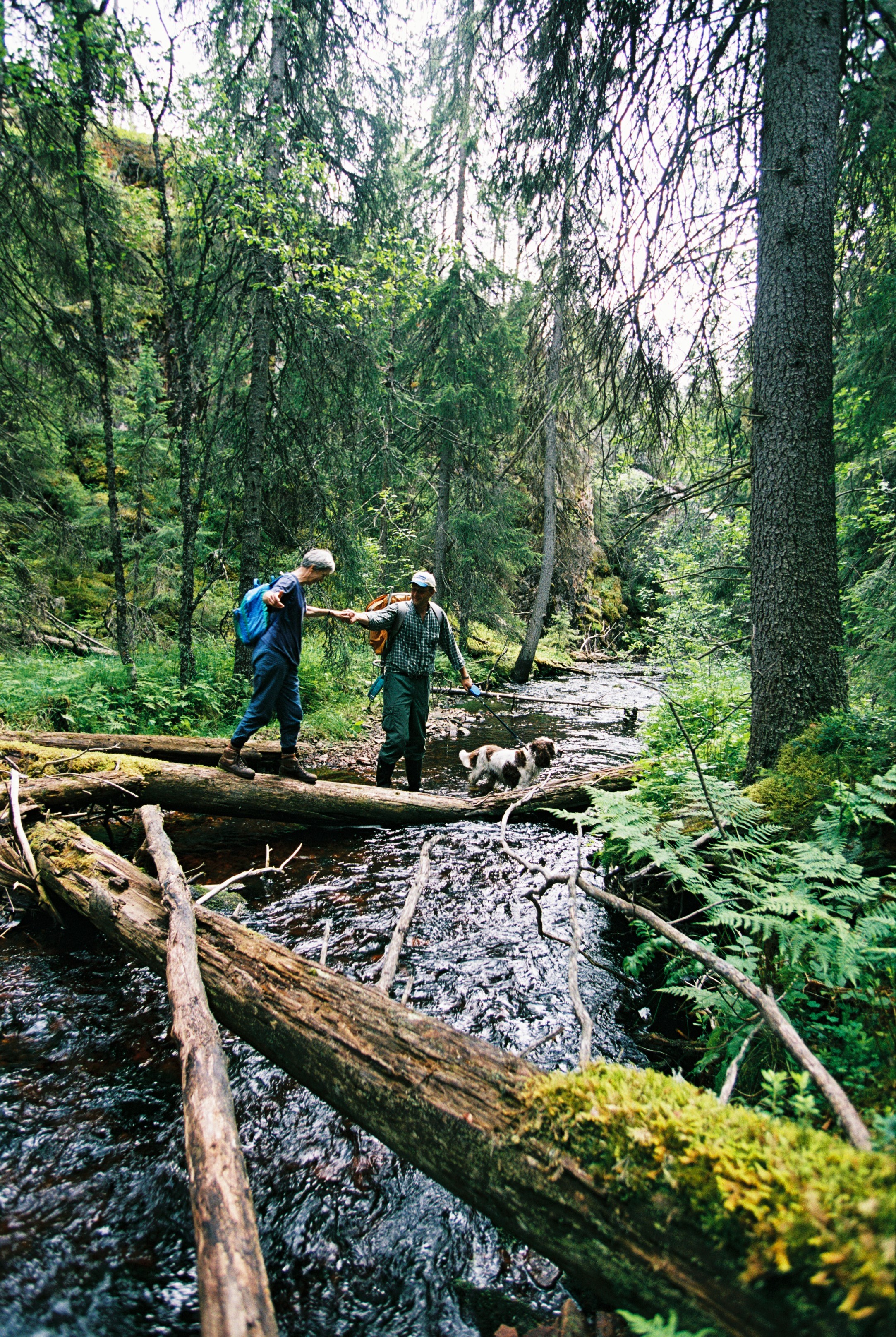 - Beskrivning: Par med hund korsar bäck, trädstam, fors, bro