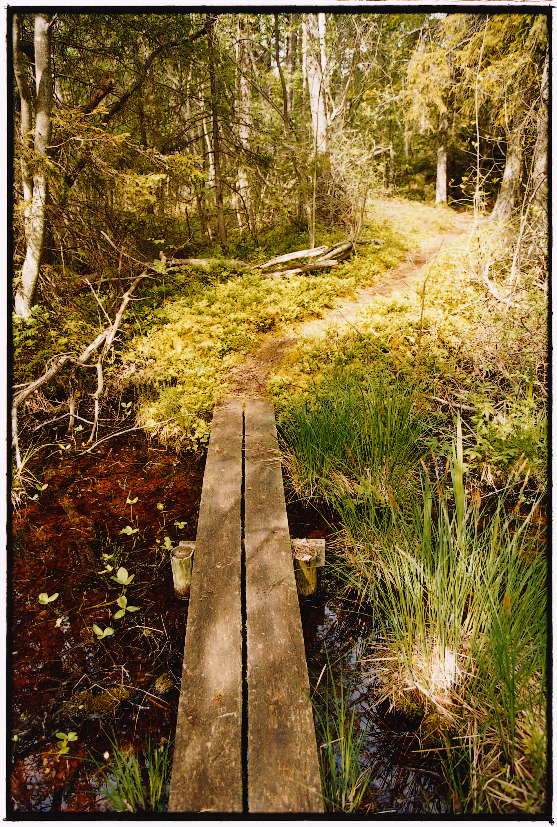 - Beskrivning: Stig i skog, spång, Böda