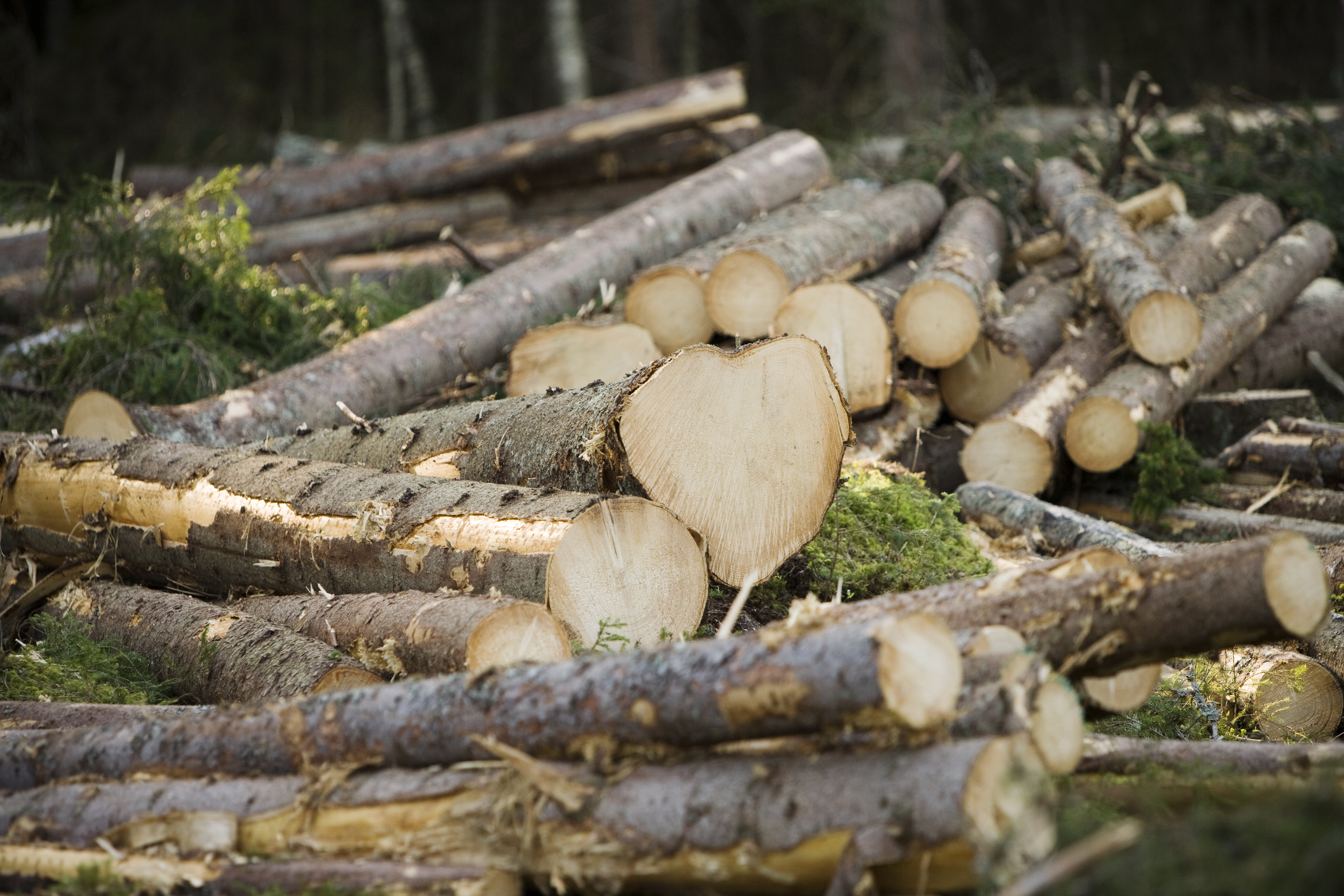 - Beskrivning: Timmer, fällda träd i väntan på skotare
