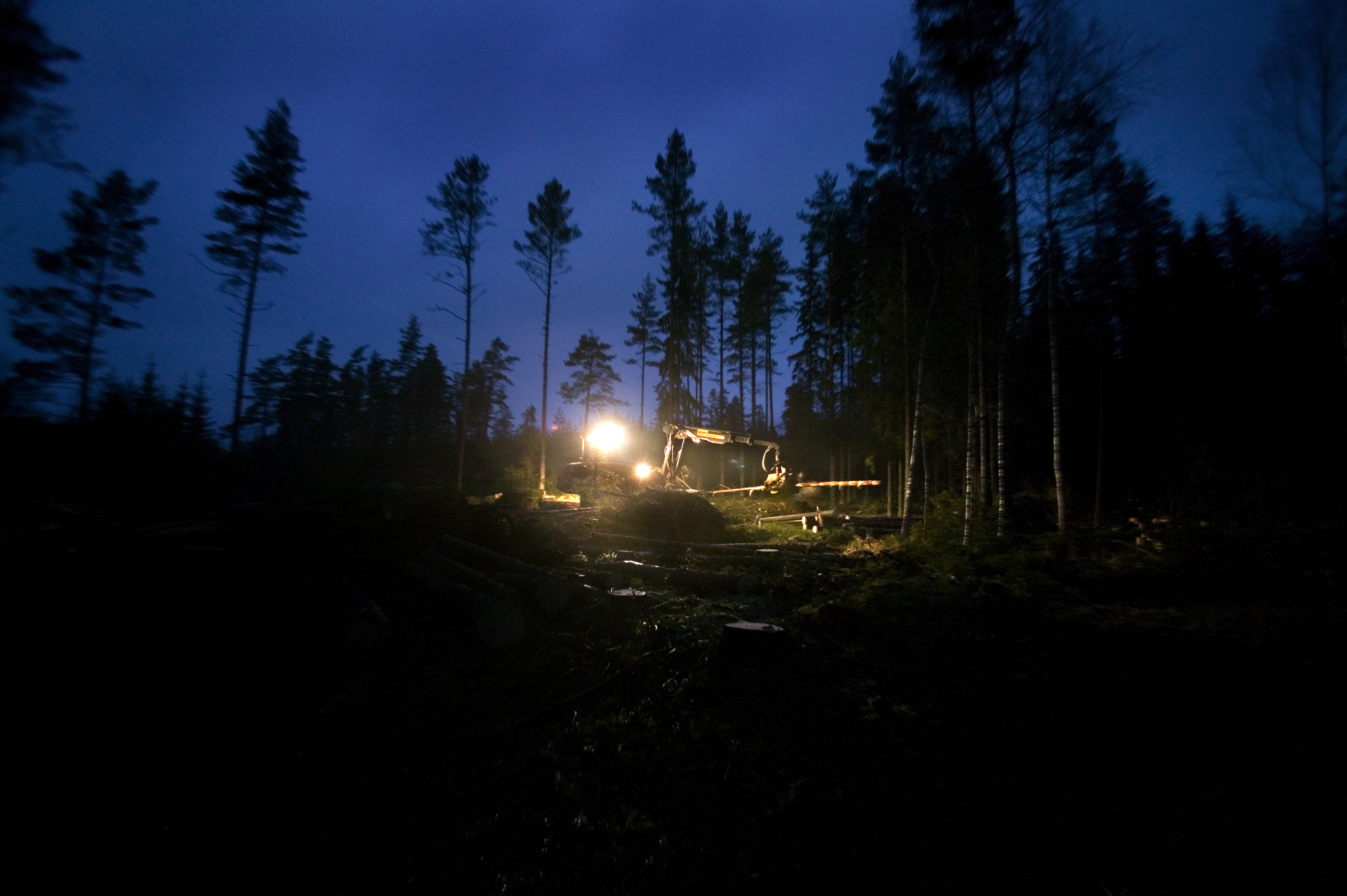 • Beskrivning: Skogsmaskin, skördare i arbete, kapar, fäller, virke