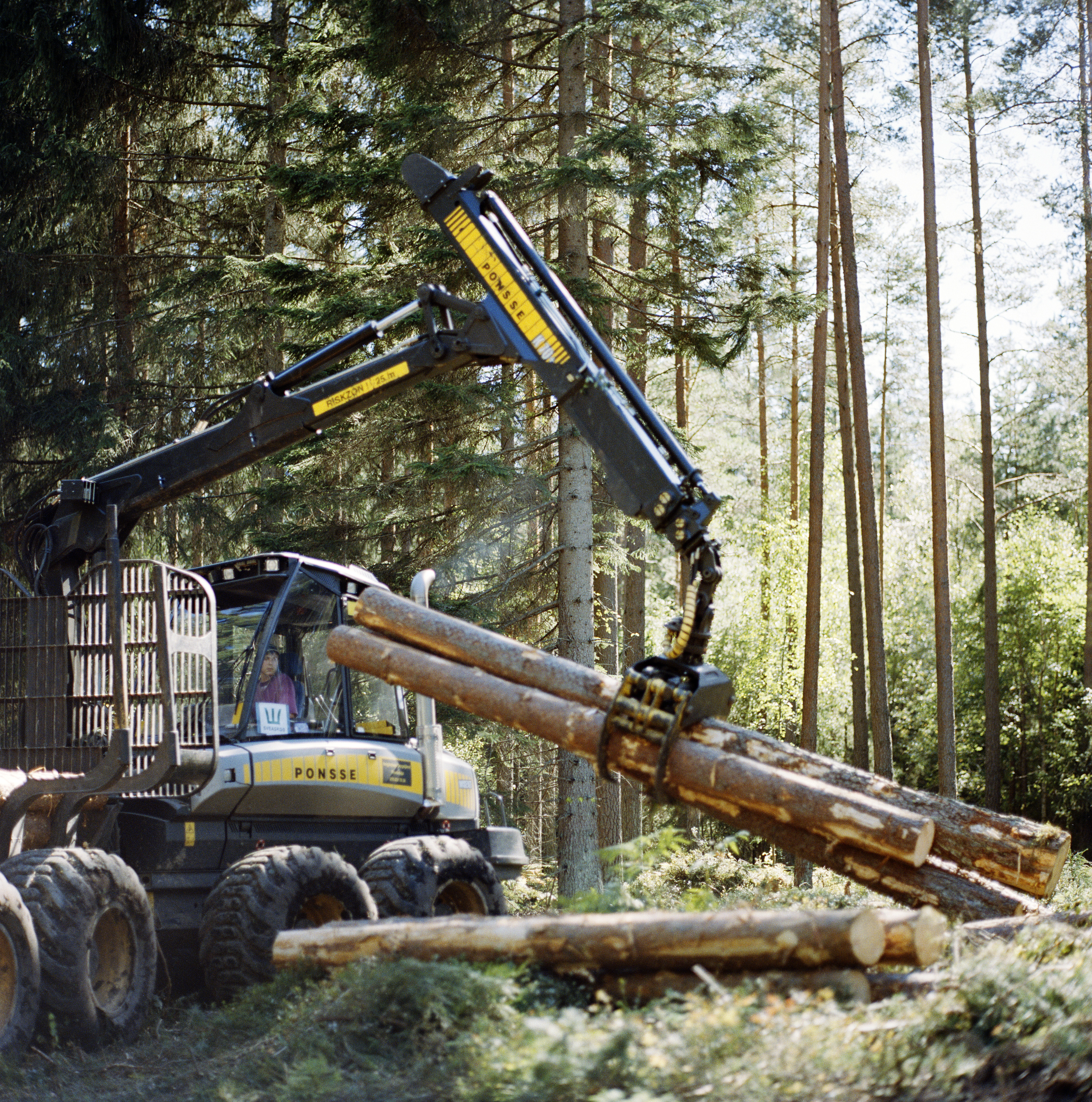 - Beskrivning: Skogsmaskin, timmer, virke, kran, Ponsse