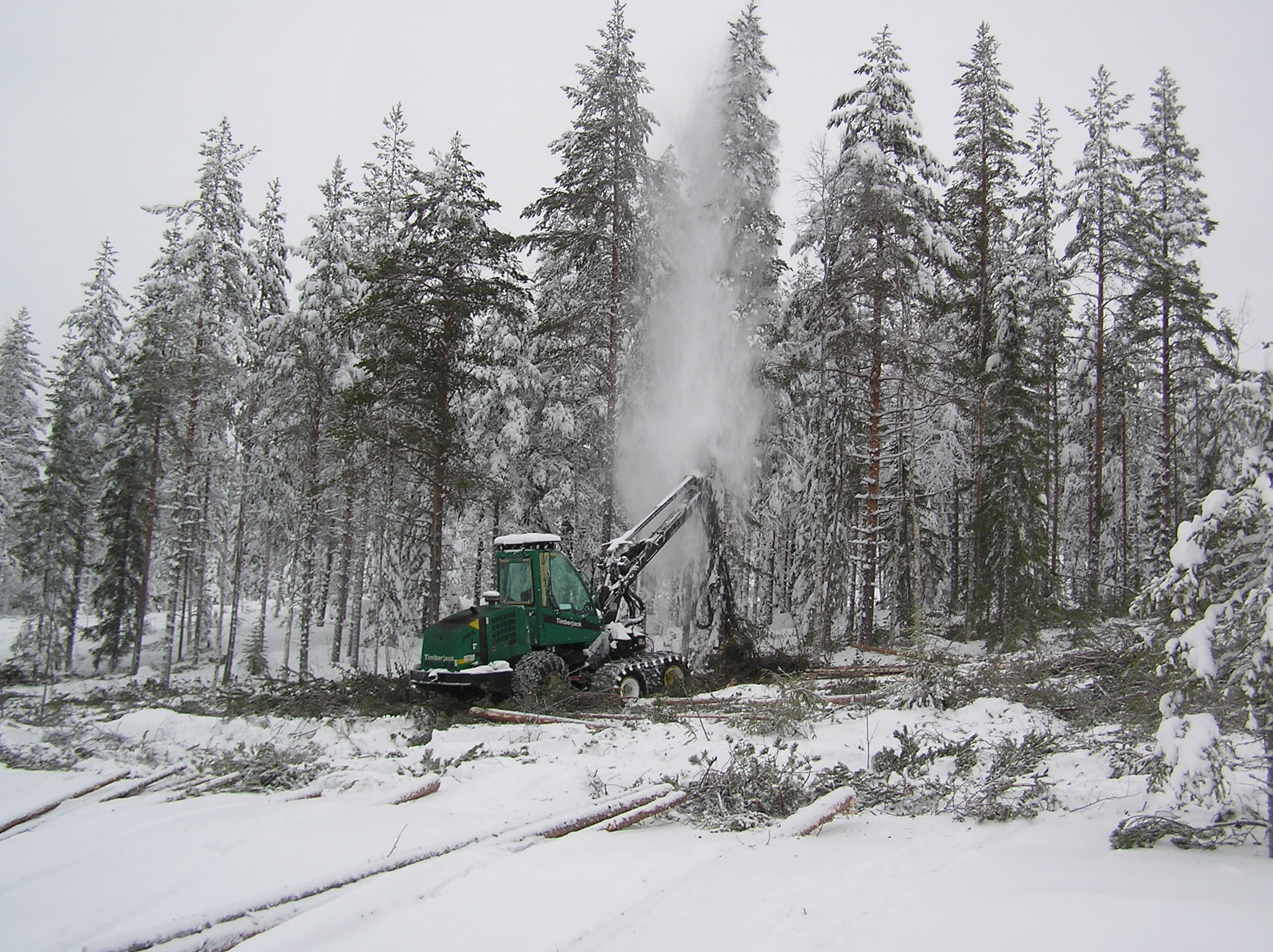 - Beskrivning: Skogsmaskiner, skördare i arbete, vinter