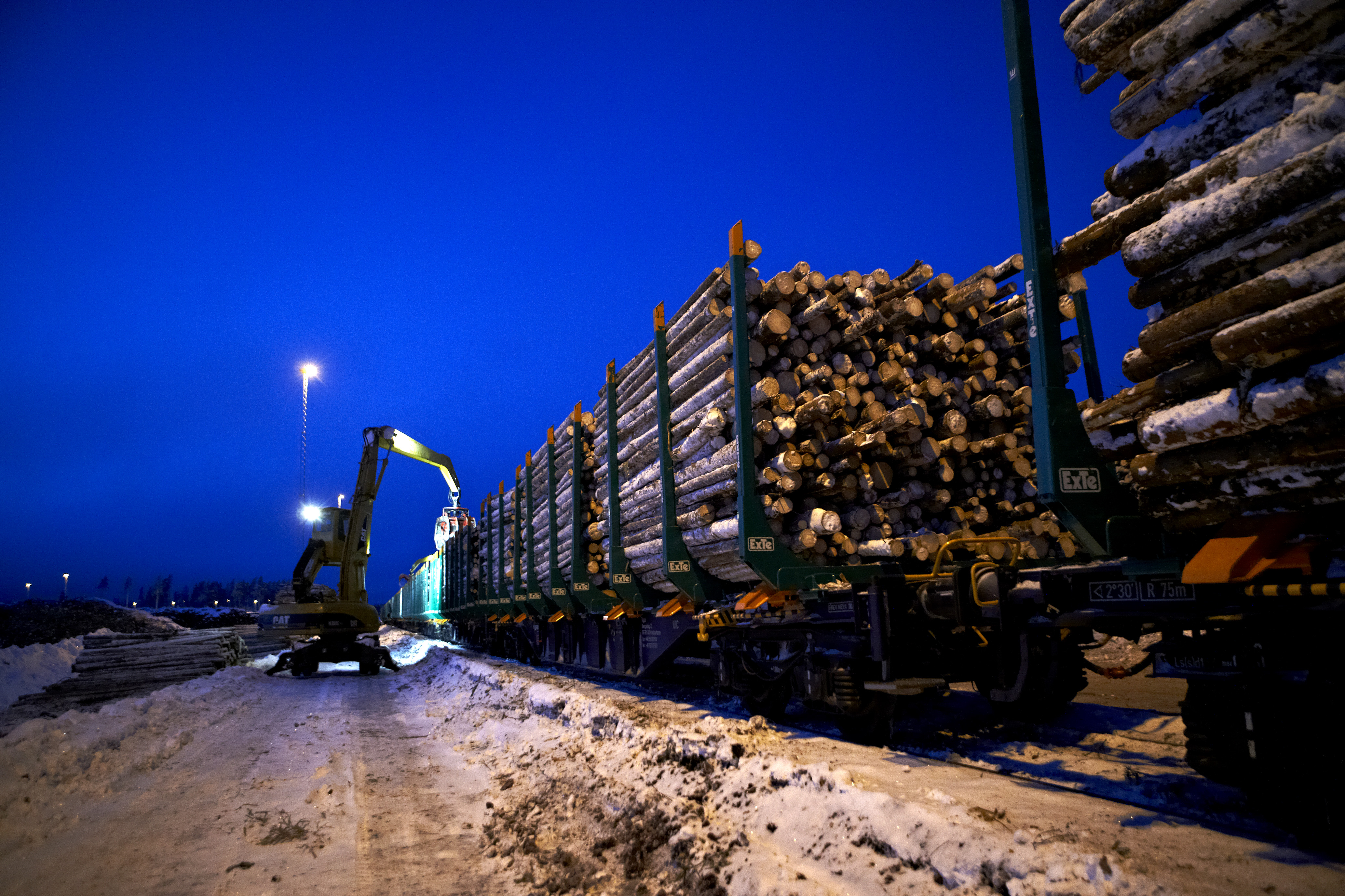 - Beskrivning: Logistik, lastning, lossning, tåg, virke, timmer, stockar, järnväg. Virkesterminal Stockaryd 2010-12-09