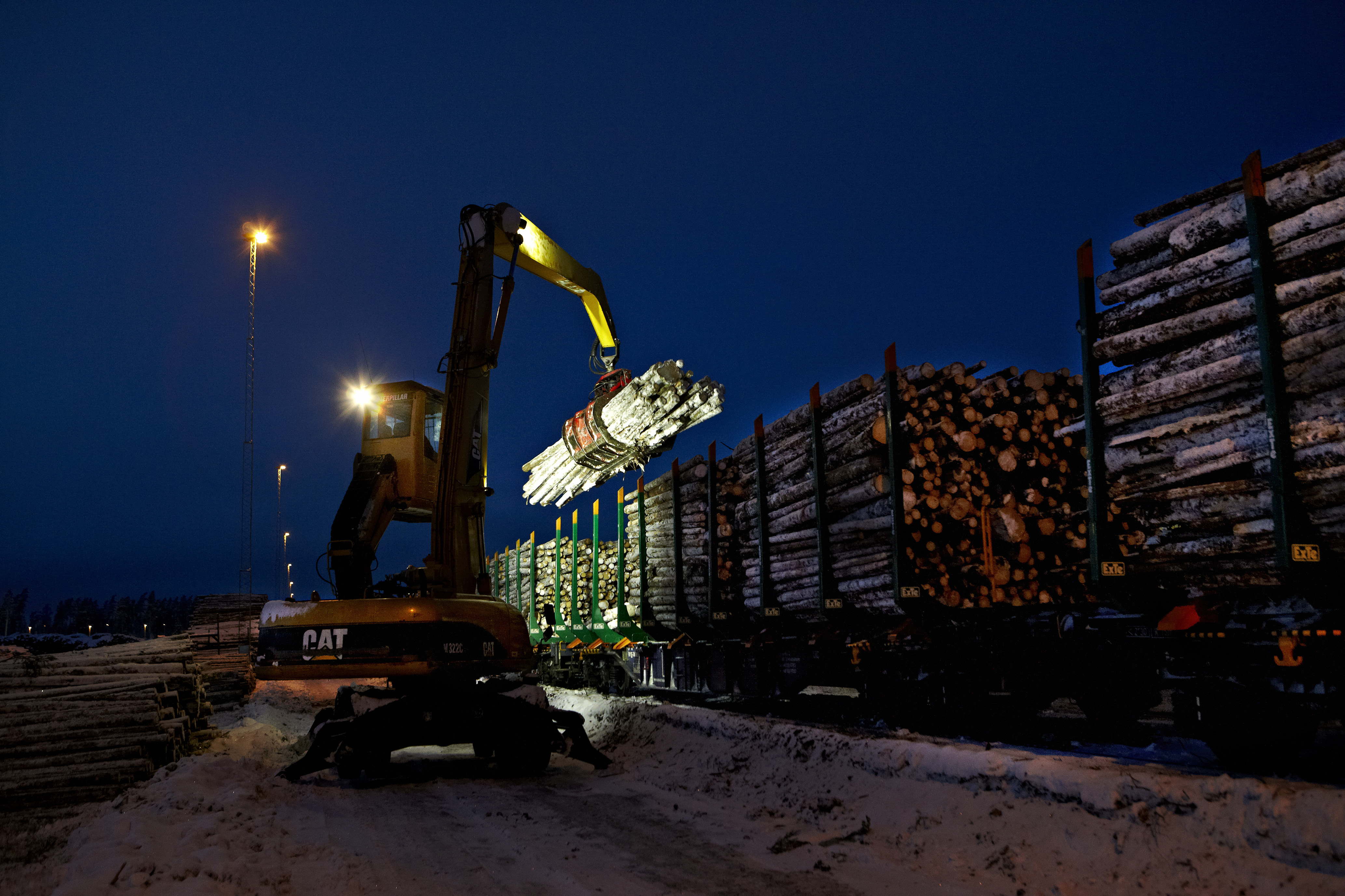 • Beskrivning: Logistik, lastning, lossning, tåg, virke, timmer, stockar, järnväg. Virkesterminal Stockaryd 2010-12-09