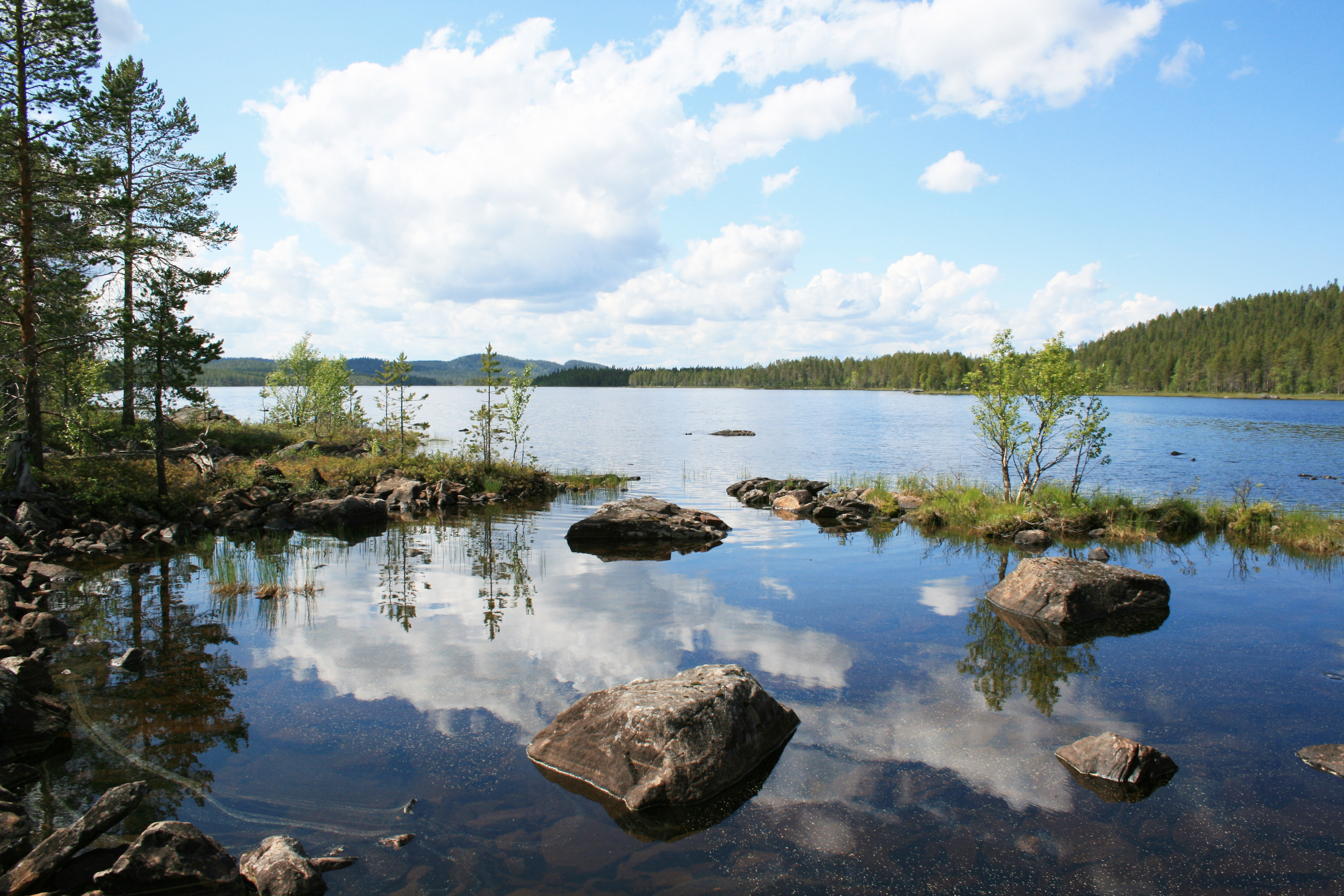 - Beskrivning: Nedre Gunnarsjön, sommar. Moln som speglar sig i vattnet.